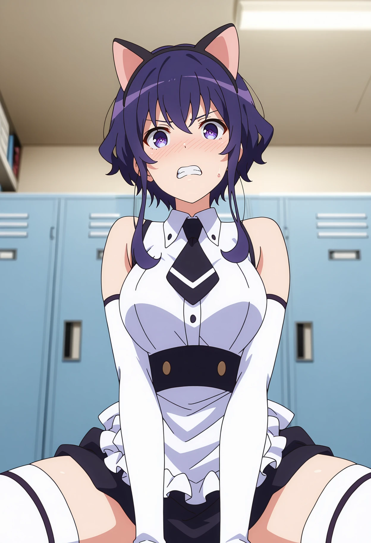 animal ear hairband, black necktie, sleeveless dress, white dress, detached sleeves, waist apron, white apron, black skirt, white thighhighs