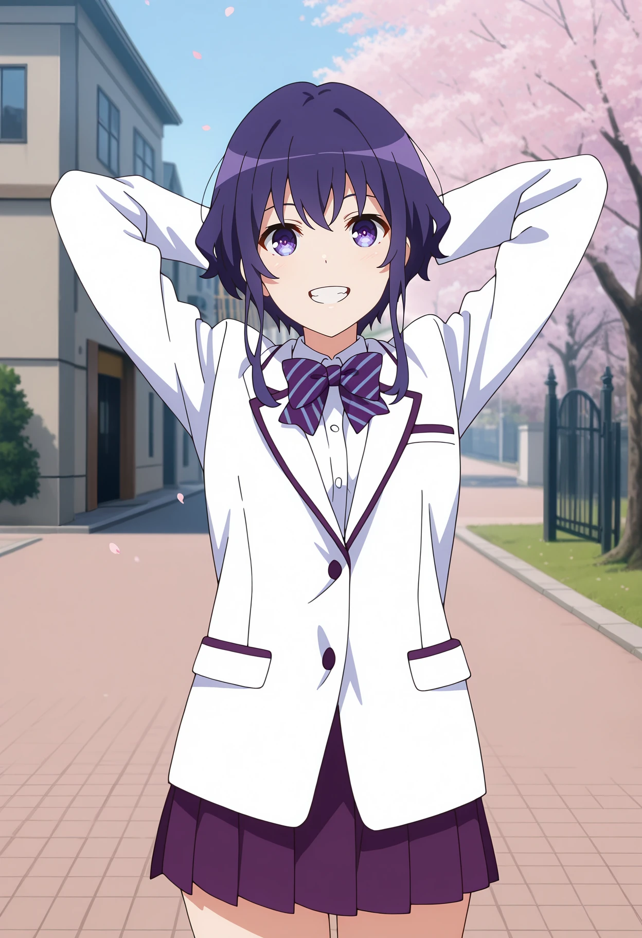 blazer, white jacket, striped bowtie, collared shirt, white shirt, purple bowtie, long sleeves, pleated skirt, purple skirt