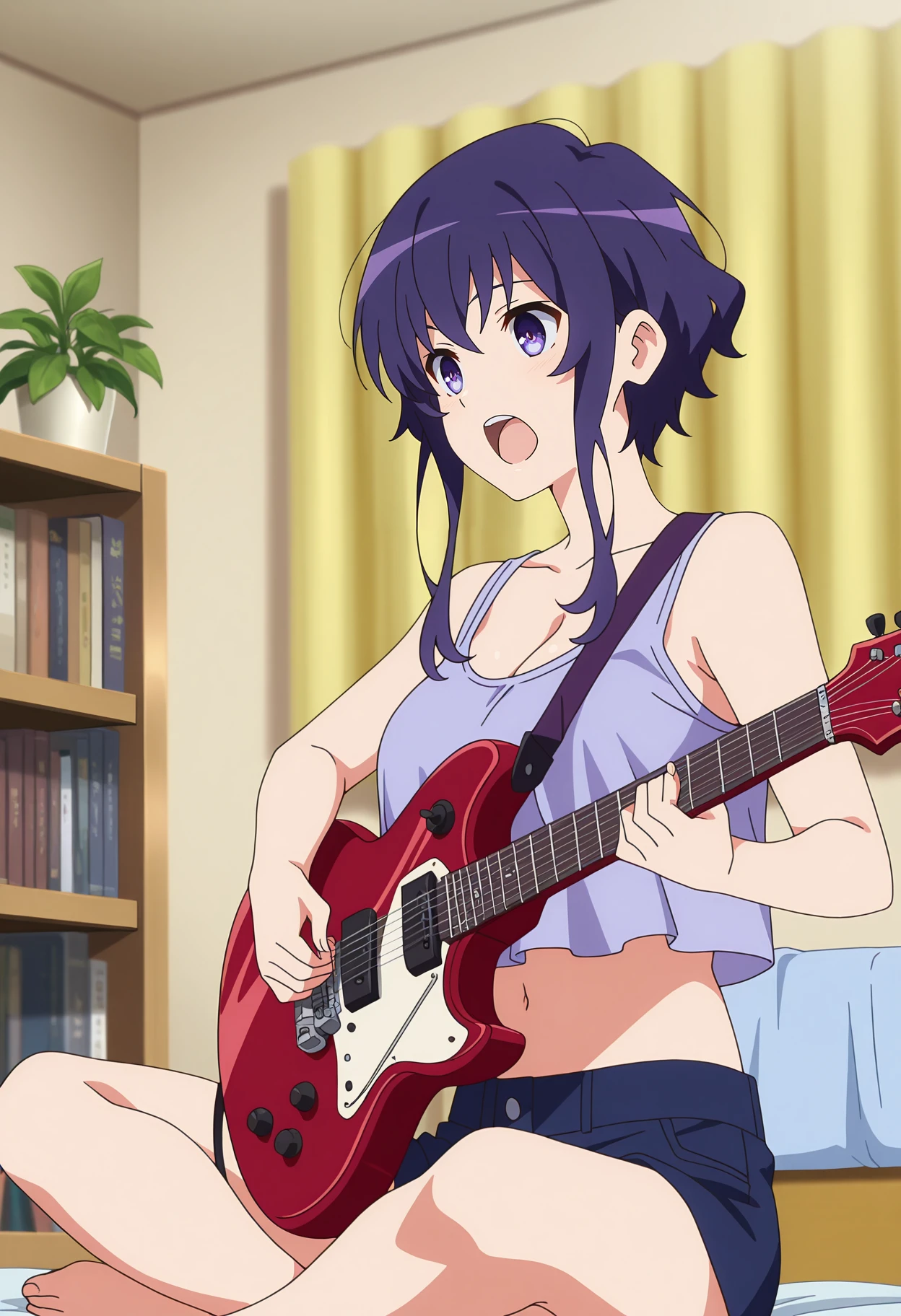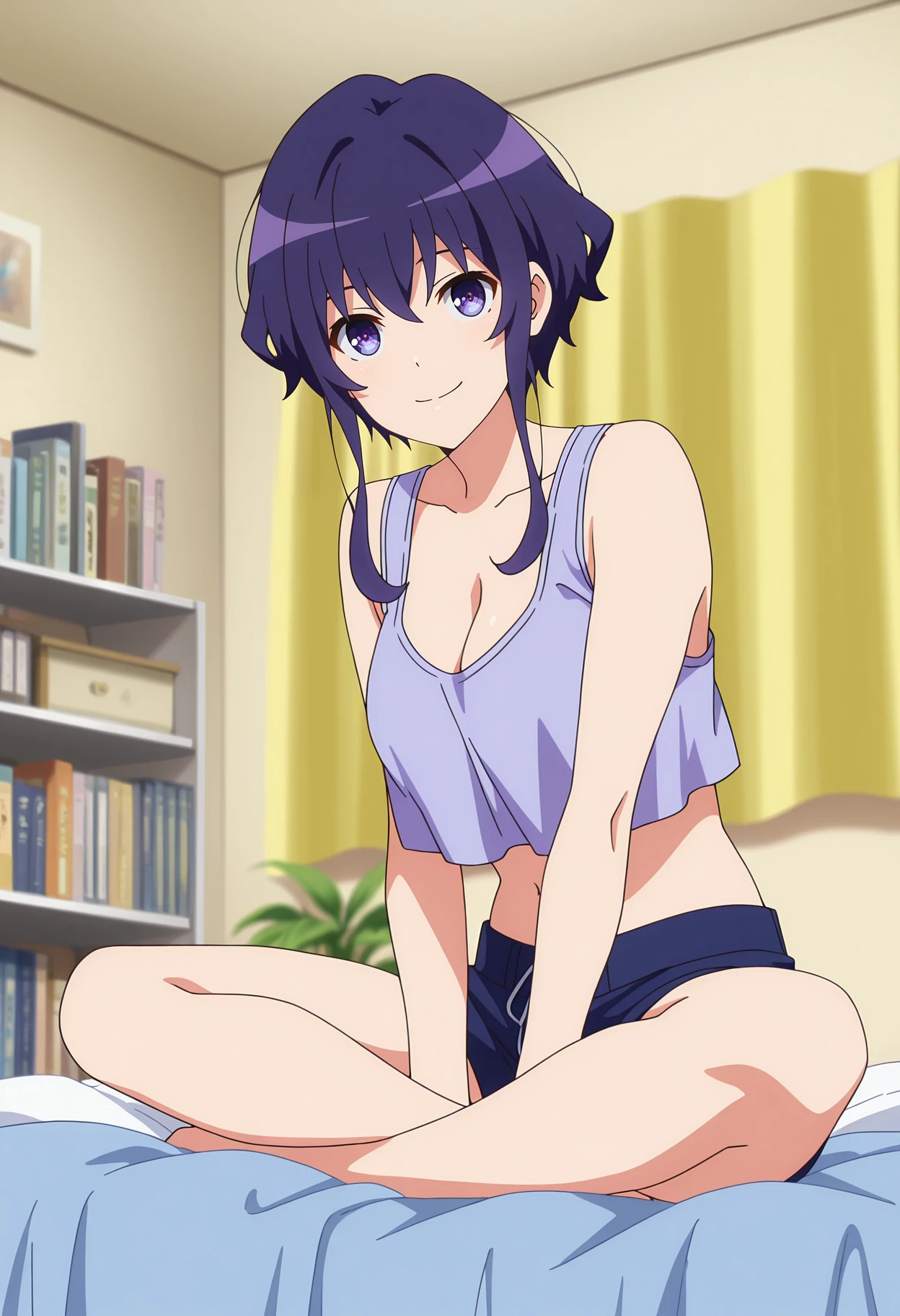 light purple tank top, cleavage, crop top overhang, navel, blue shorts