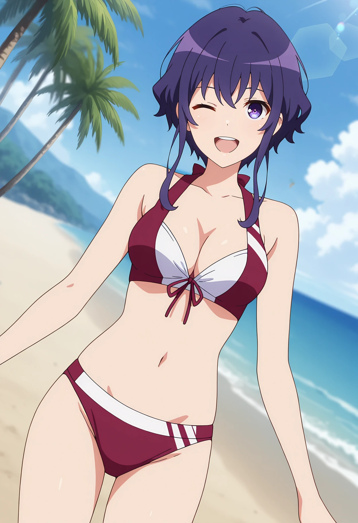 front-tie bikini top, sports bikini, multicolored bikini, red bikini, white bikini, cleavage, medium breasts