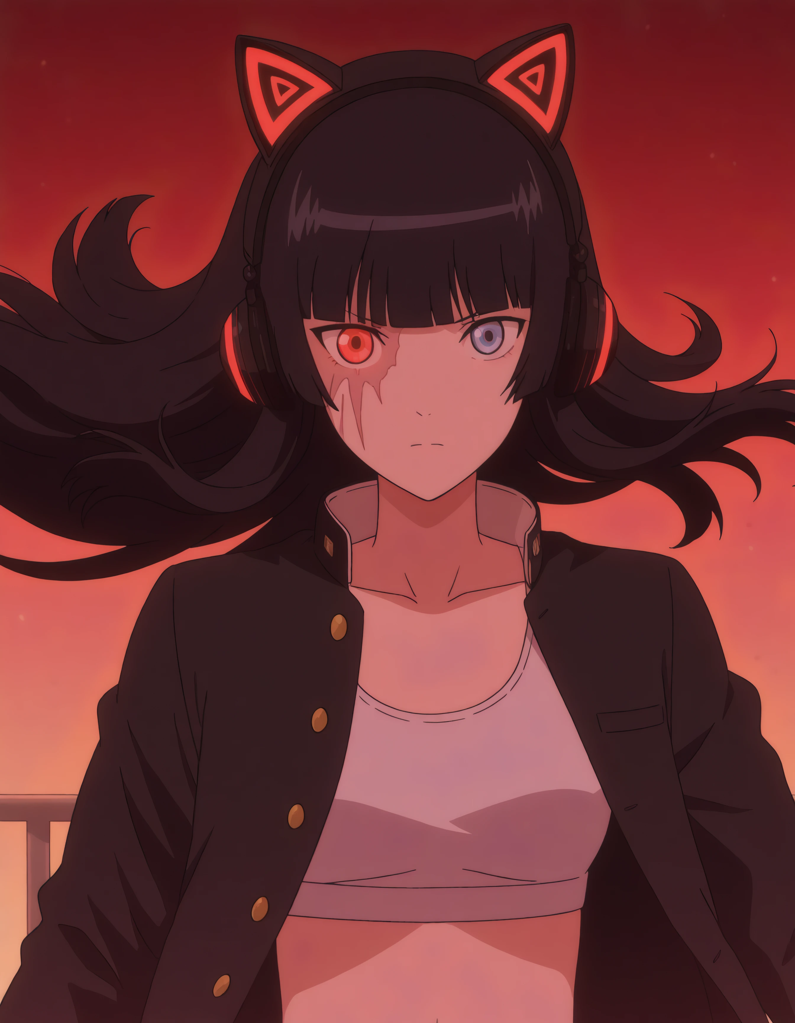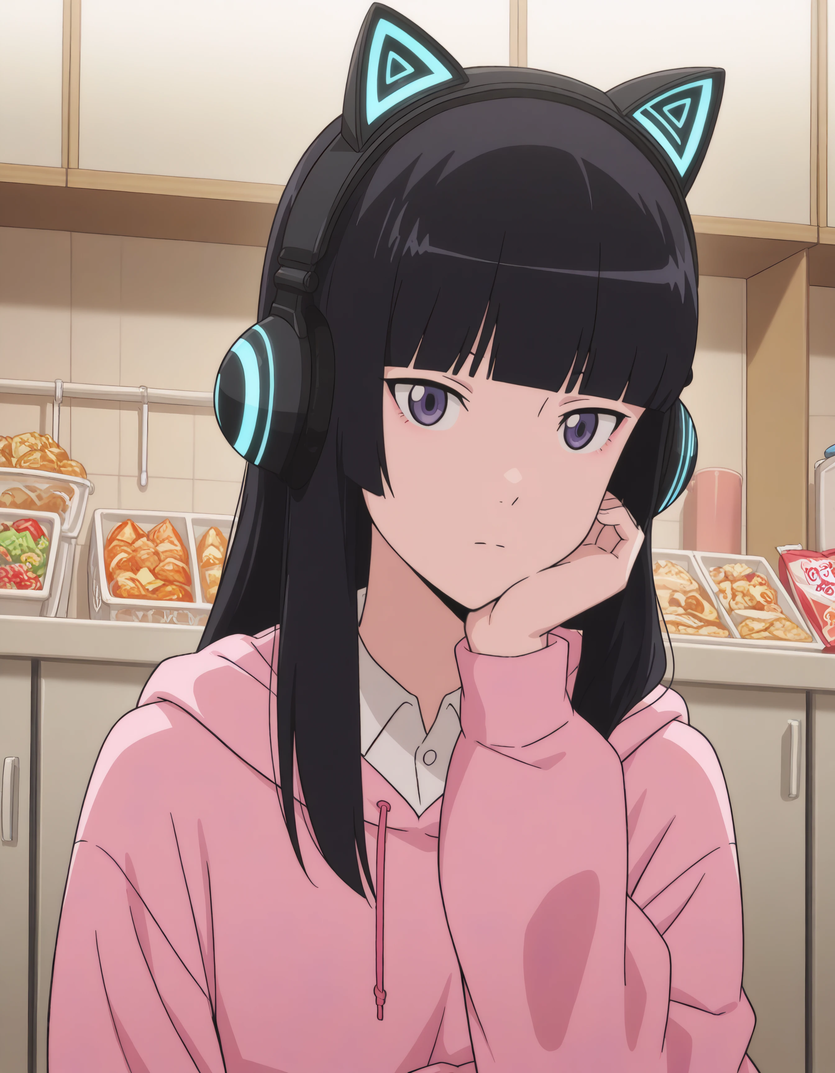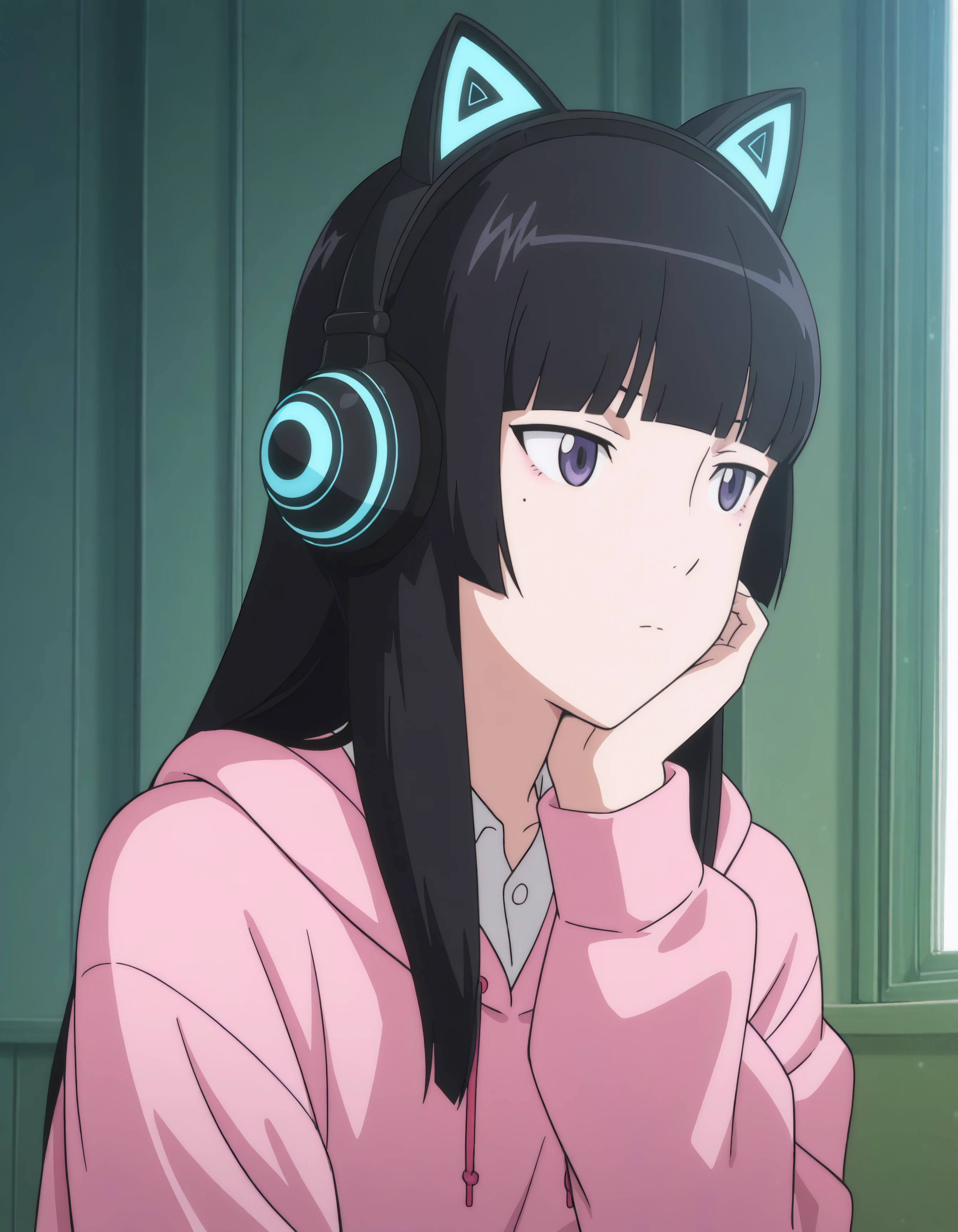 TRIGGER: black hair, navy eyes, cat ear shaped headphones, fake cat ears
