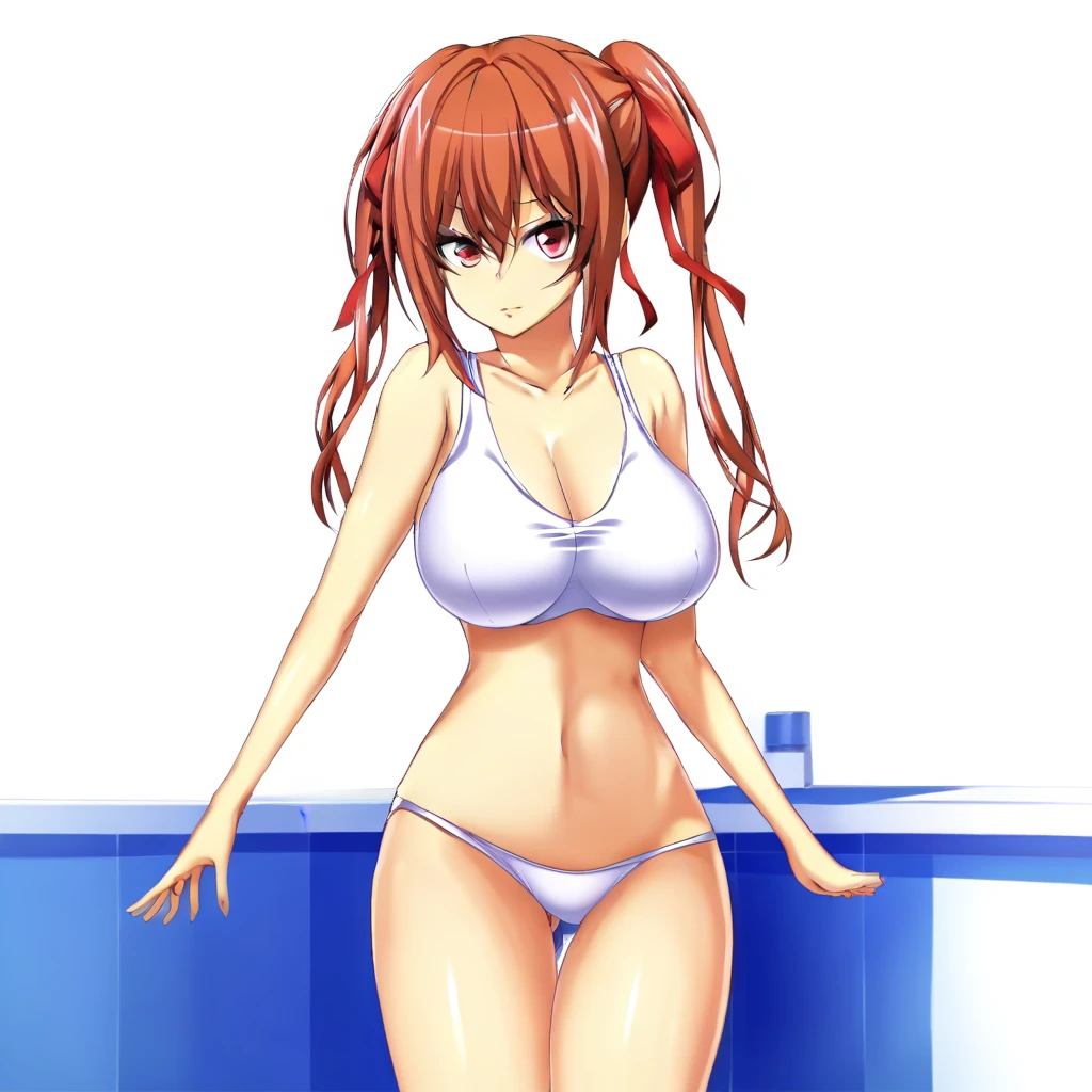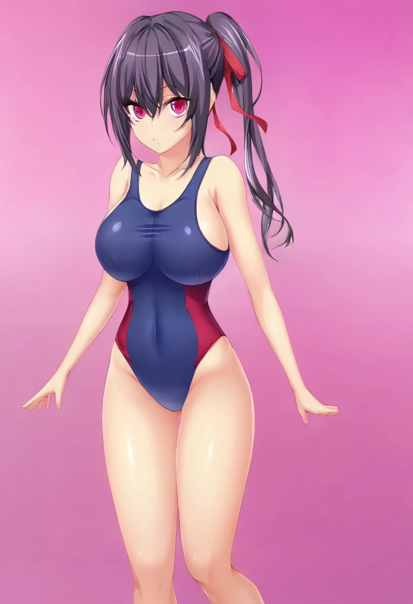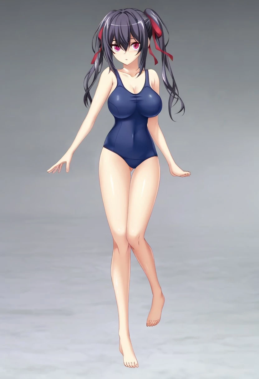 Kiryuu Asuka, black hair, Eyes Pink,Huge Breasts, Pale, Slim,Ribbon Hair Tie,School Swimsuit,