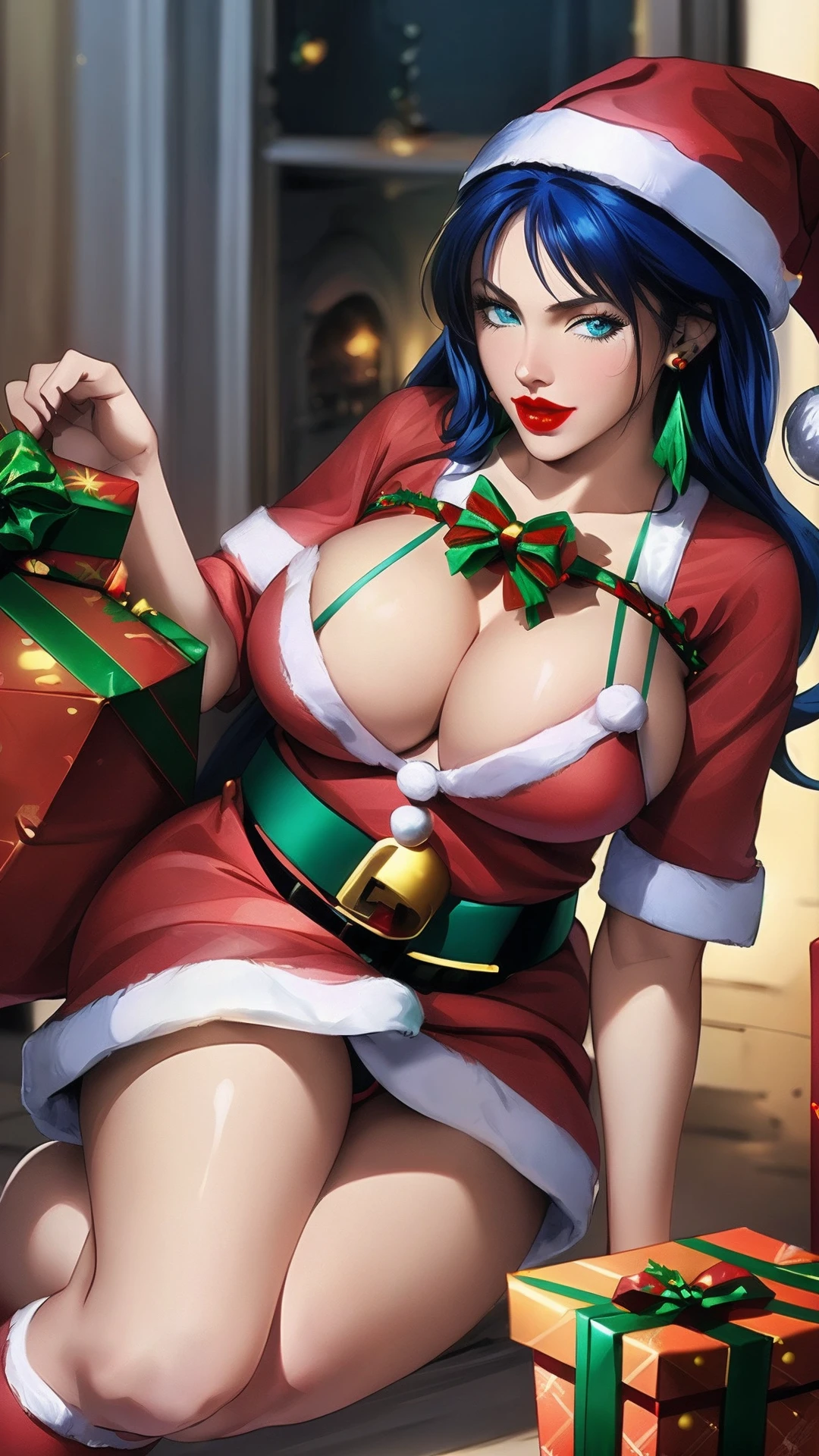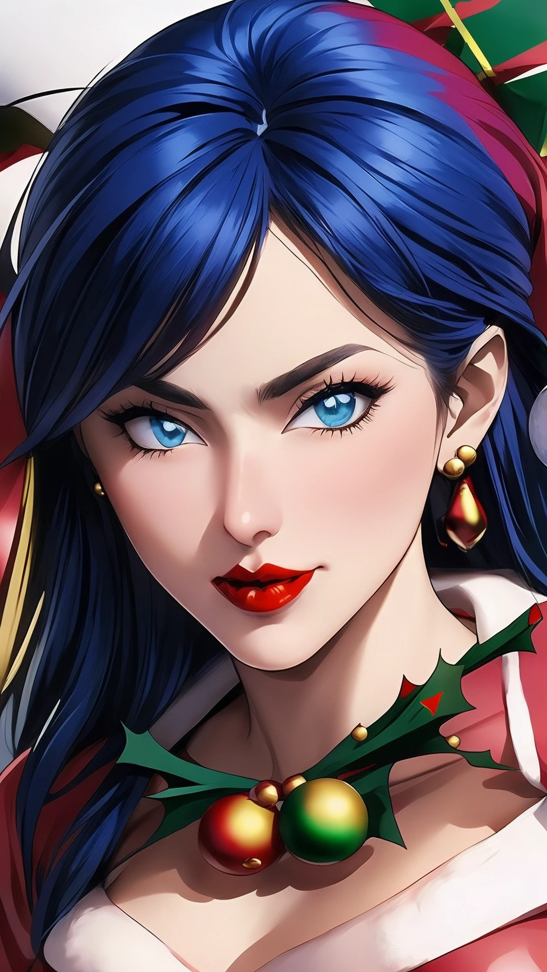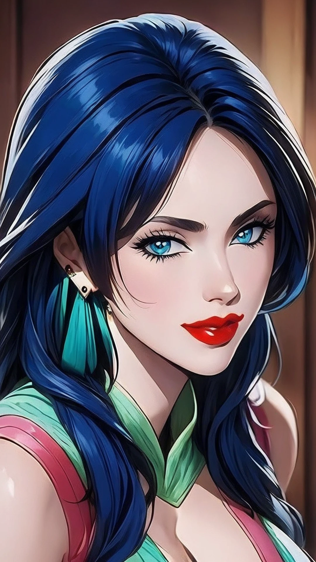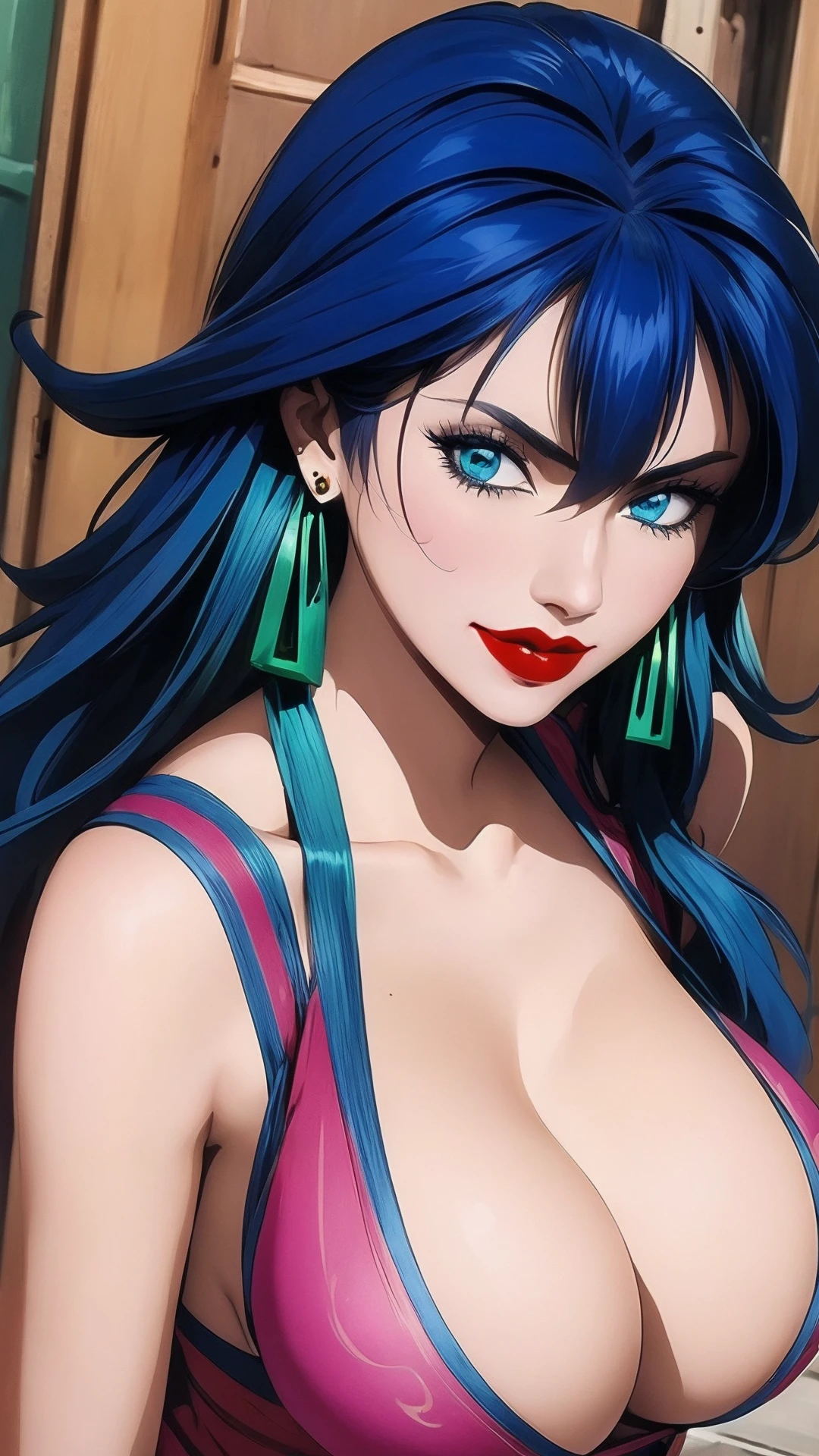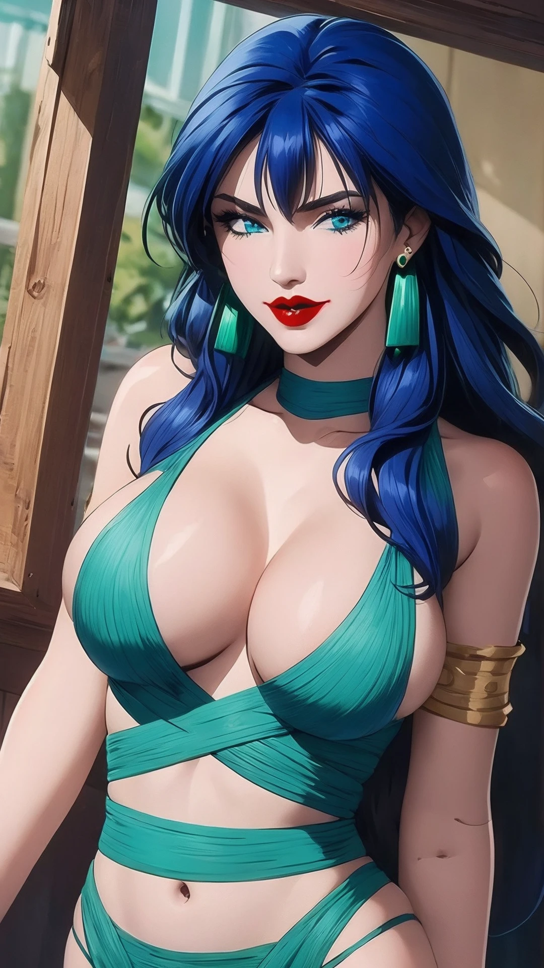 shan, blue hair, long hair, green eyes, earring, lipstick, big breast,
