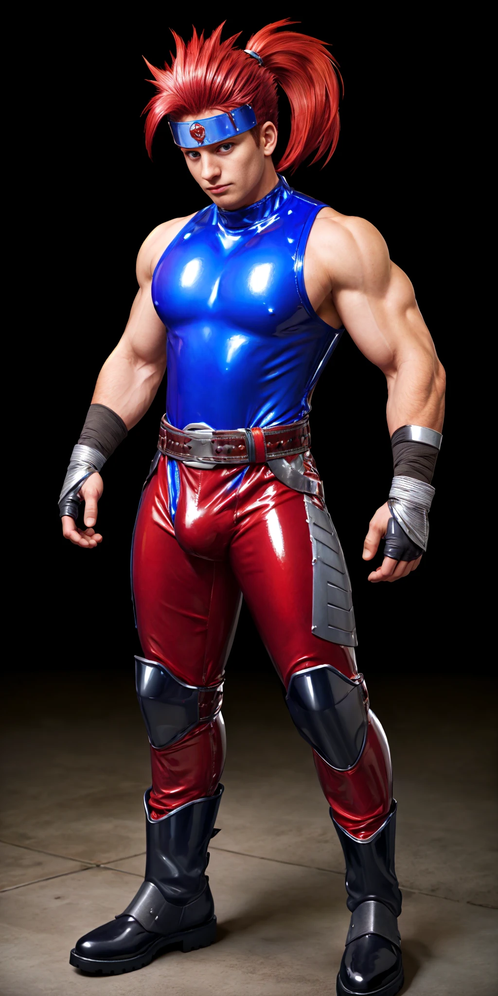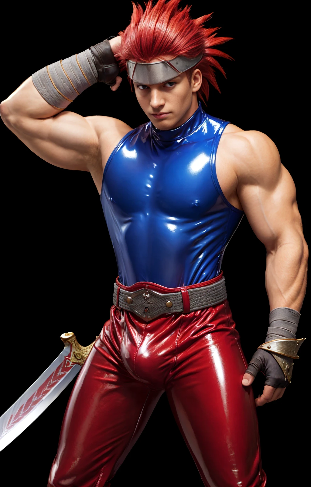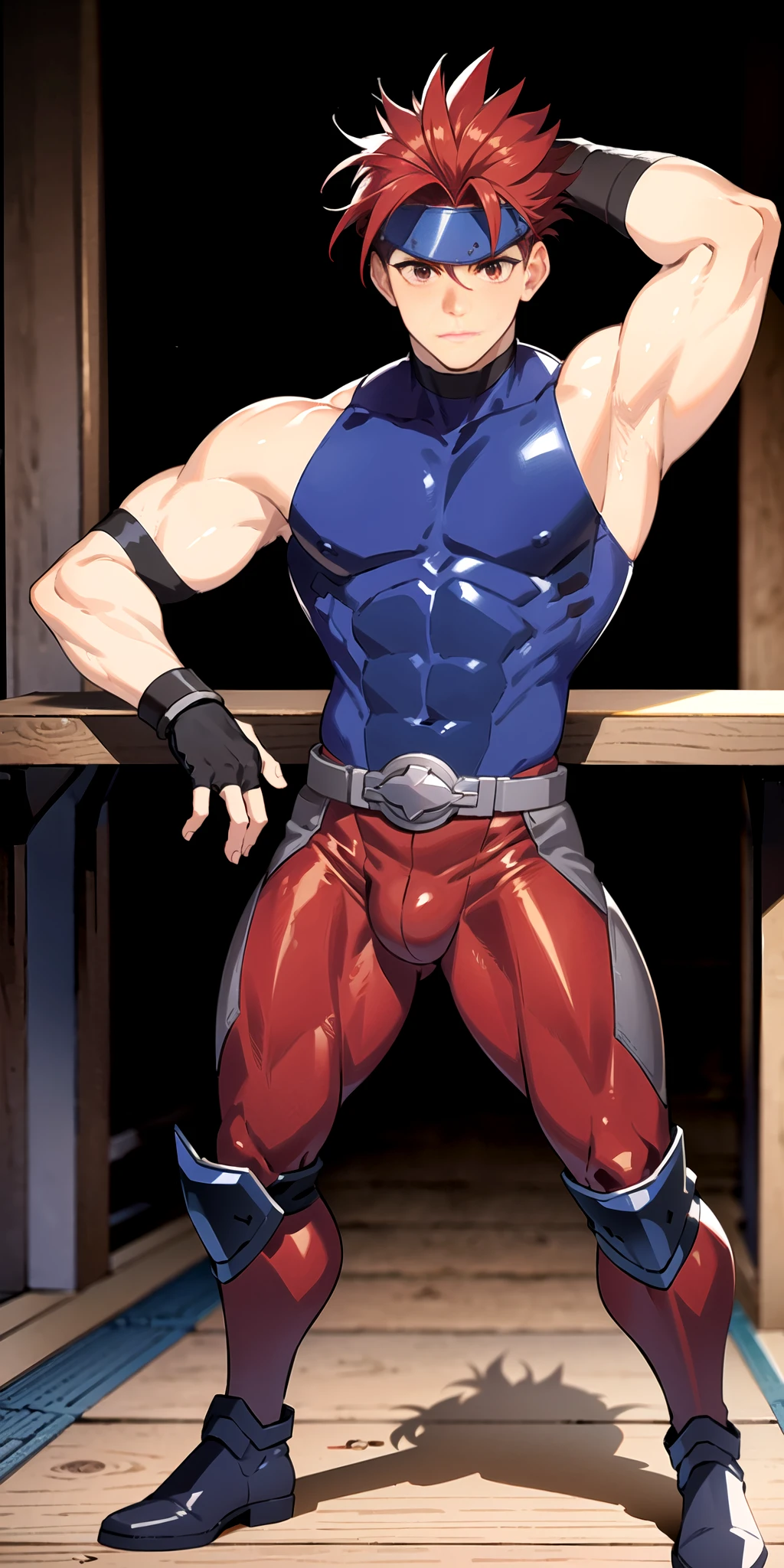 Yashblade, 1boy, red hair, (blue shirt, sleeveless shirt, sleeveless), belt, red and gray tights, metalic boots, righ arm bandages, fingerless gloves, spiky hair, (side small ponytail), red hair, japanese, (big metal plate on forehead), bulge, , armored boots, blue boots,