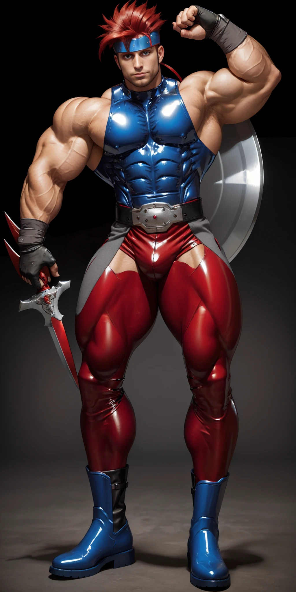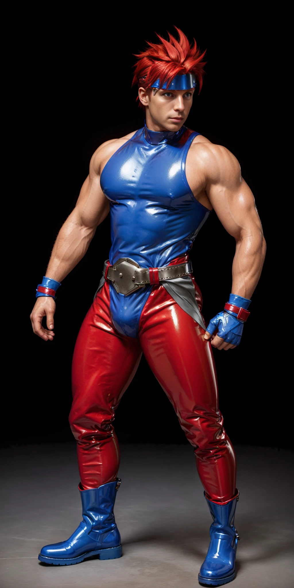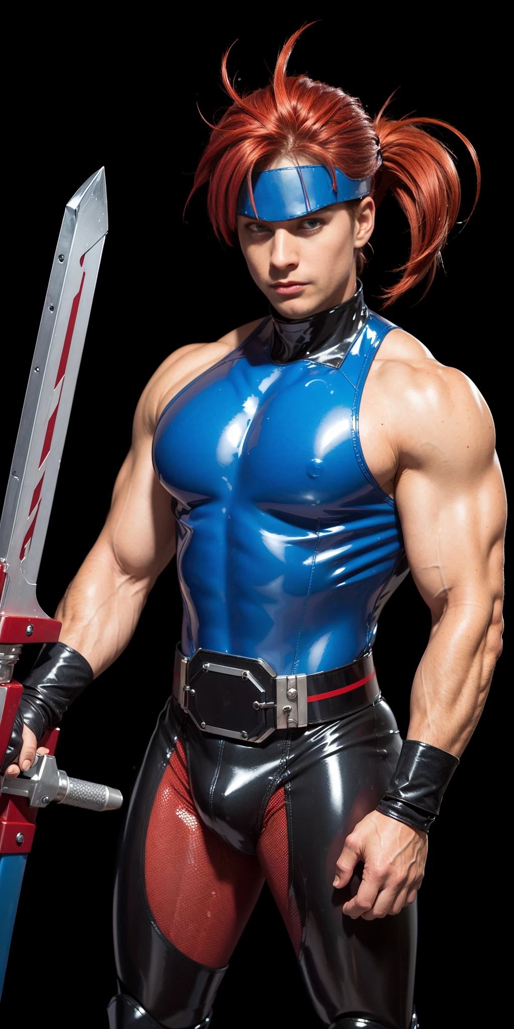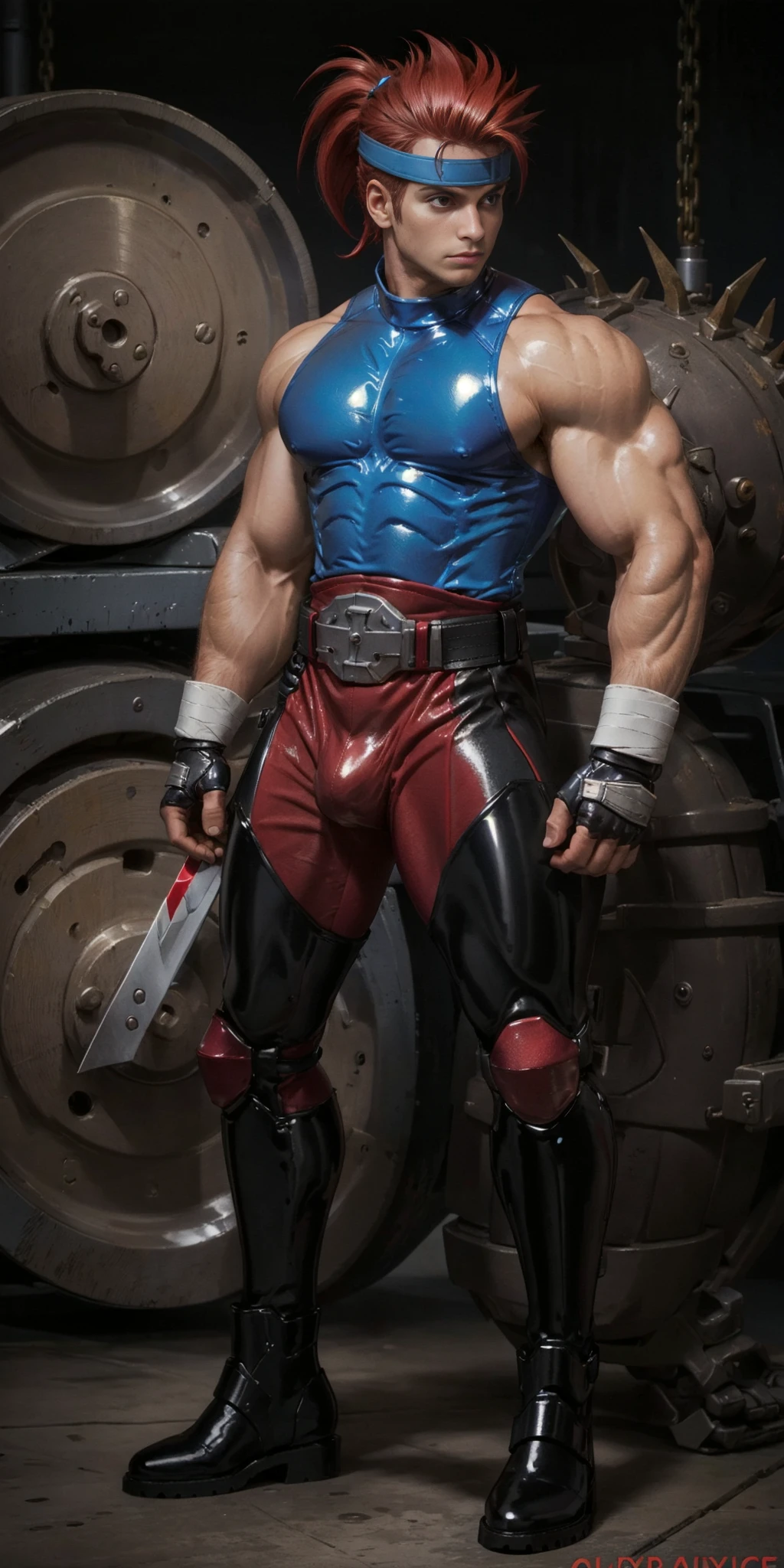 Yashblade, 1boy, red hair, (blue shirt, sleeveless shirt, sleeveless), belt, red and gray tights, metalic boots, righ arm bandages, fingerless gloves, spiky hair, (side small ponytail), red hair, japanese, (big metal plate on forehead), bulge, , armored boots, blue boots,