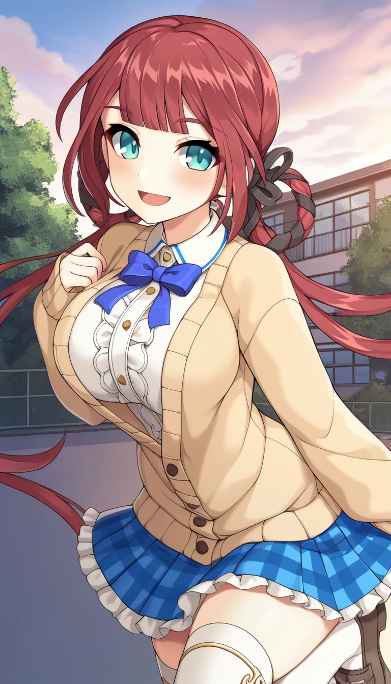 Student Costume (Michael): taikobo\(legend clover\), studentCostume, 1girl, long hair, aqua eyes, large breasts, red hair, twintails, low twintails, sidelocks, blunt bangs, hair rings, braided hair rings, black hair ribbon, blue bowtie, large breasts, white shirt, collared shirt, long sleeves, sleeves past wrists, school uniform, brown cardigan, center frills, buttons, blue trim, pleated skirt, plaid skirt, frilled skirt, miniskirt, blue skirt, white thighhighs, brown footwear, loafers,