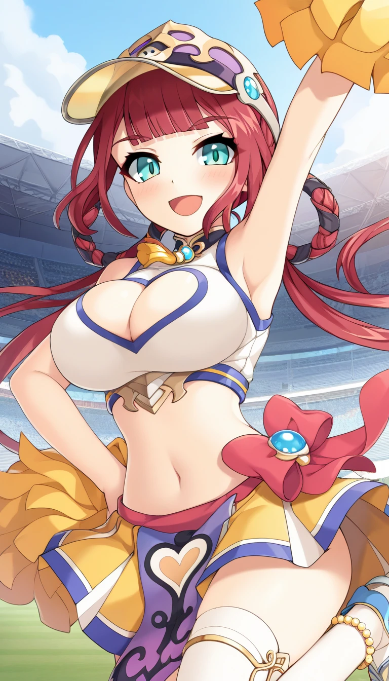 Cheerleader Costume: taikobo\(legend clover\), cheerleaderCostume, 1girl, red hair, long hair, twintails, twin braids, low twintails, sidelocks, blunt bangs, aqua eyes, baseball cap, yellow visor cap, purple headwear, hair rings, braided hair rings, blue pearl, pearl brooch, tassel brooch, large breasts, cleavage, cleavage cutout, framed breasts, bare shoulders, bare arms, white shirt, sleeveless, sleeveless shirt, crop top, gold trim, blue trim, yellow trim, midriff, stomach, navel, pleated skirt, miniskirt, yellow skirt, white trim, heart print, purple loincloth, print loincloth, red waist bow, white thighhighs, sneakers, two-tone footwear, blue footwear, white footwear, anklet