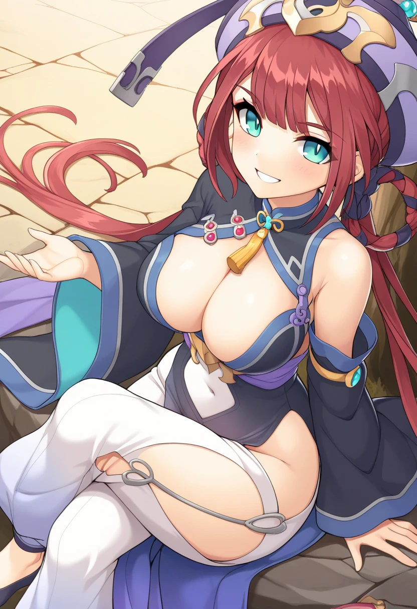 1girl, red hair, long hair, sidelocks, low twintails, aqua eyes, purple headwear, jewelry, hair rings, braided hair rings, tassel choker, large breasts, cleavage, framed breasts, single bare shoulder, gradient dress, black dress, sleeveless dress, long sleeves, wide sleeves, detached sleeves, black sleeves, light blue lining, purple sash, pelvic curtain, covered navel, navel, navel cutout, groin, grey trim, blue trim, white pants, puffy pants, thigh cutout, detached leggings, side slit, flats, black footwear, purple footwear,