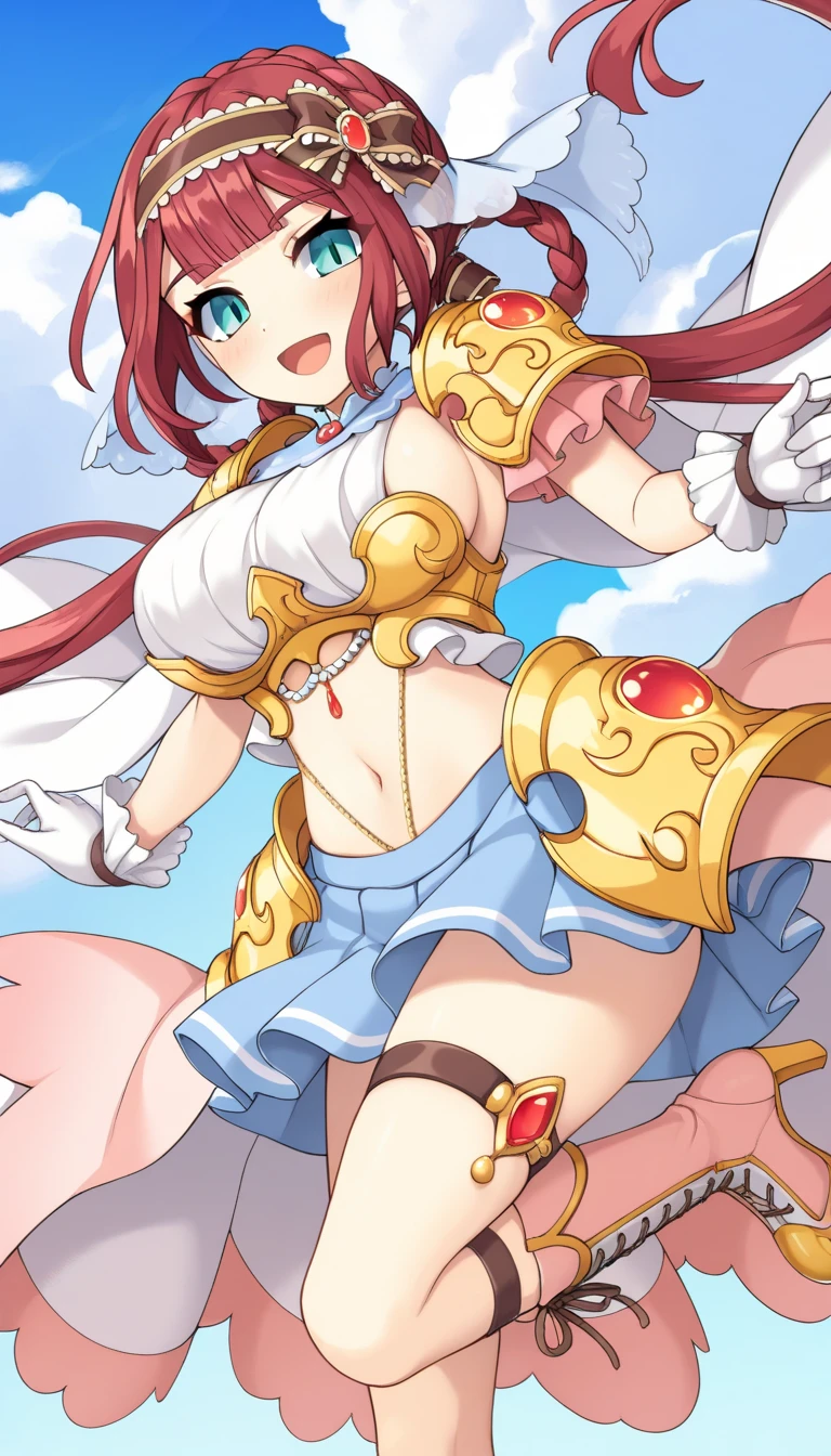 Sol default Costume: 1girl, red hair, long hair, low twintails, sidelocks, blunt bangs, aqua eyes, hair rings, braided hair rings, brown hairband, patterned hairband, hair bow, brown bow, patterned bow, light blue veil, light blue patterned ribbon, jewelry, large breasts, sideboob, white shirt, white crop top, scalloped collar, scalloped trim, pink short sleeves, frilled sleeves, frilled gloves, white gloves, gold shoulder armor, gold armor, gold breastplate, gold hip armor, white cape, pauldron cape, split cape, pink waist cape, overskirt, midriff, navel, gold trim, red gem, pearl belly chain, belly red gem pendant, light blue miniskirt, pleated skirt, thigh strap, high heels, knee boots, two-tone boots, cross-laced footwear, pink footwear