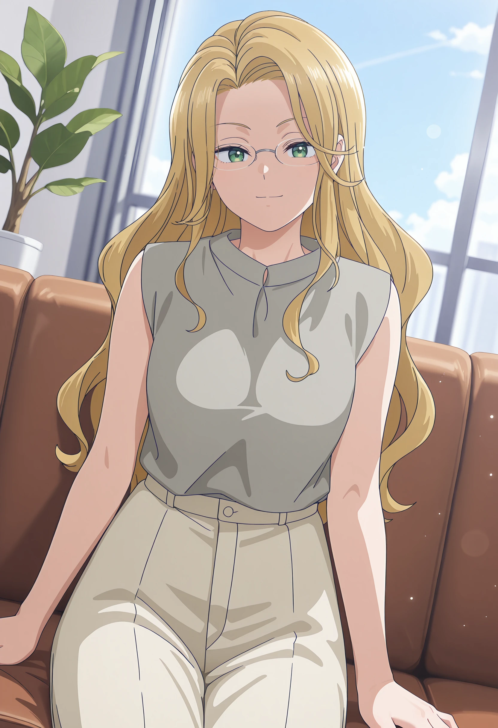 AmekimiMimi, green eyes, blonde hair, long hair, curtained hair, asymmetrical sidelocks, rimless eyewear