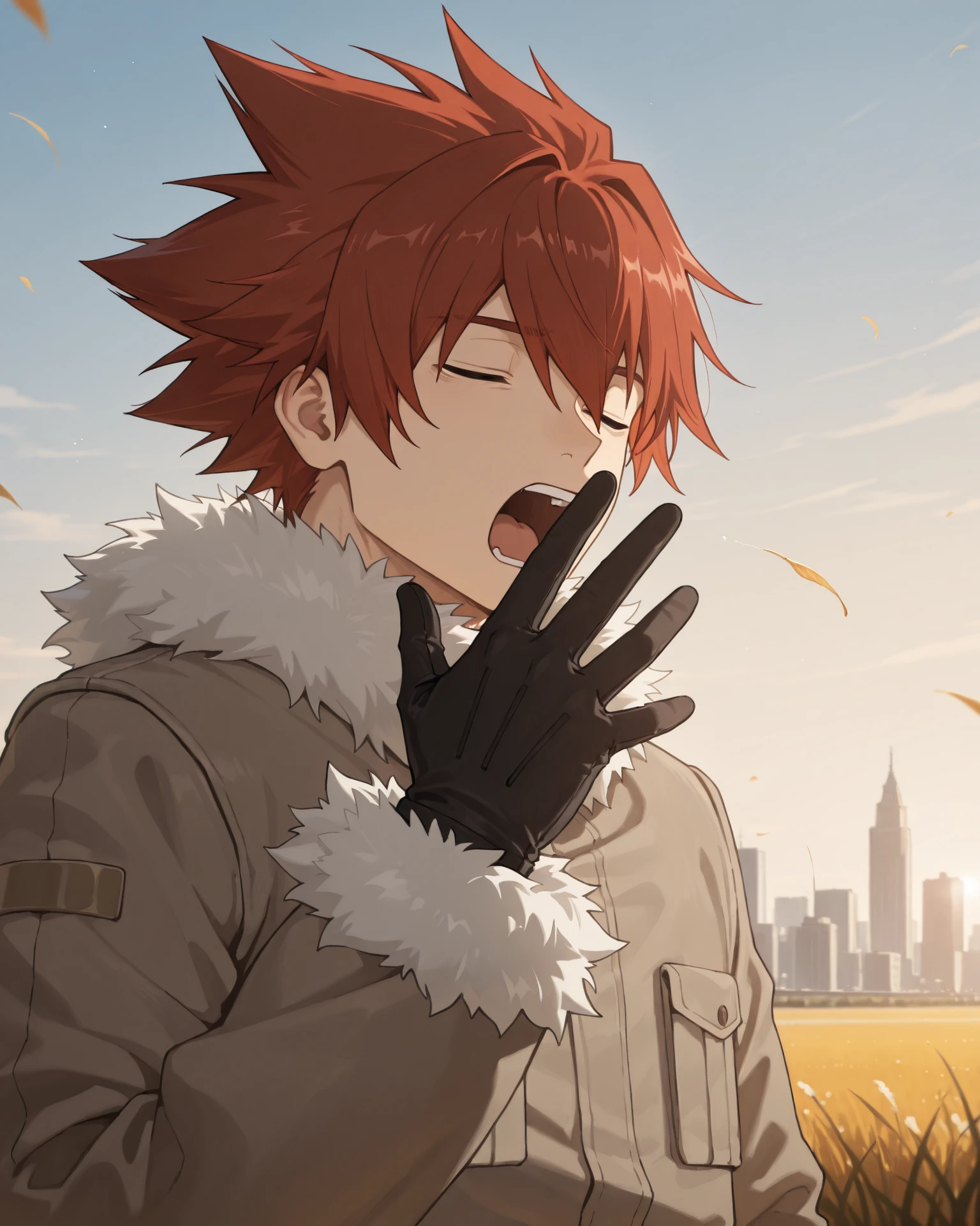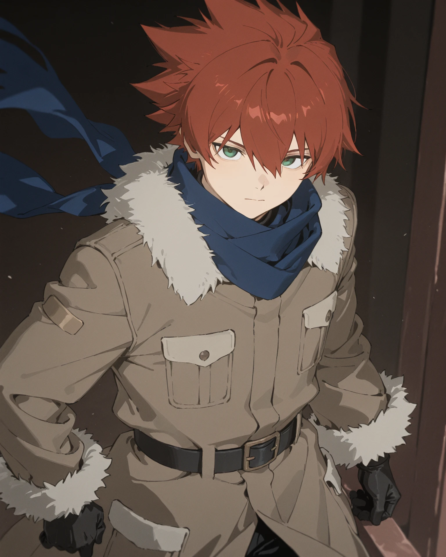 Default outfit: light brown coat, fur-trimmed coat, blue scarf, black gloves, black pants, black belt, brown boots
