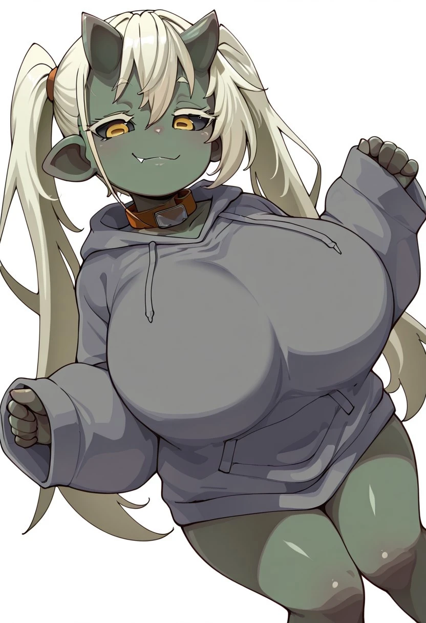 Goblin_Girl, shortstack, colored skin, green skin, horns, black sclera, yellow eyes, pointy ears, fang, long hair, twintails, collar, huge breasts,