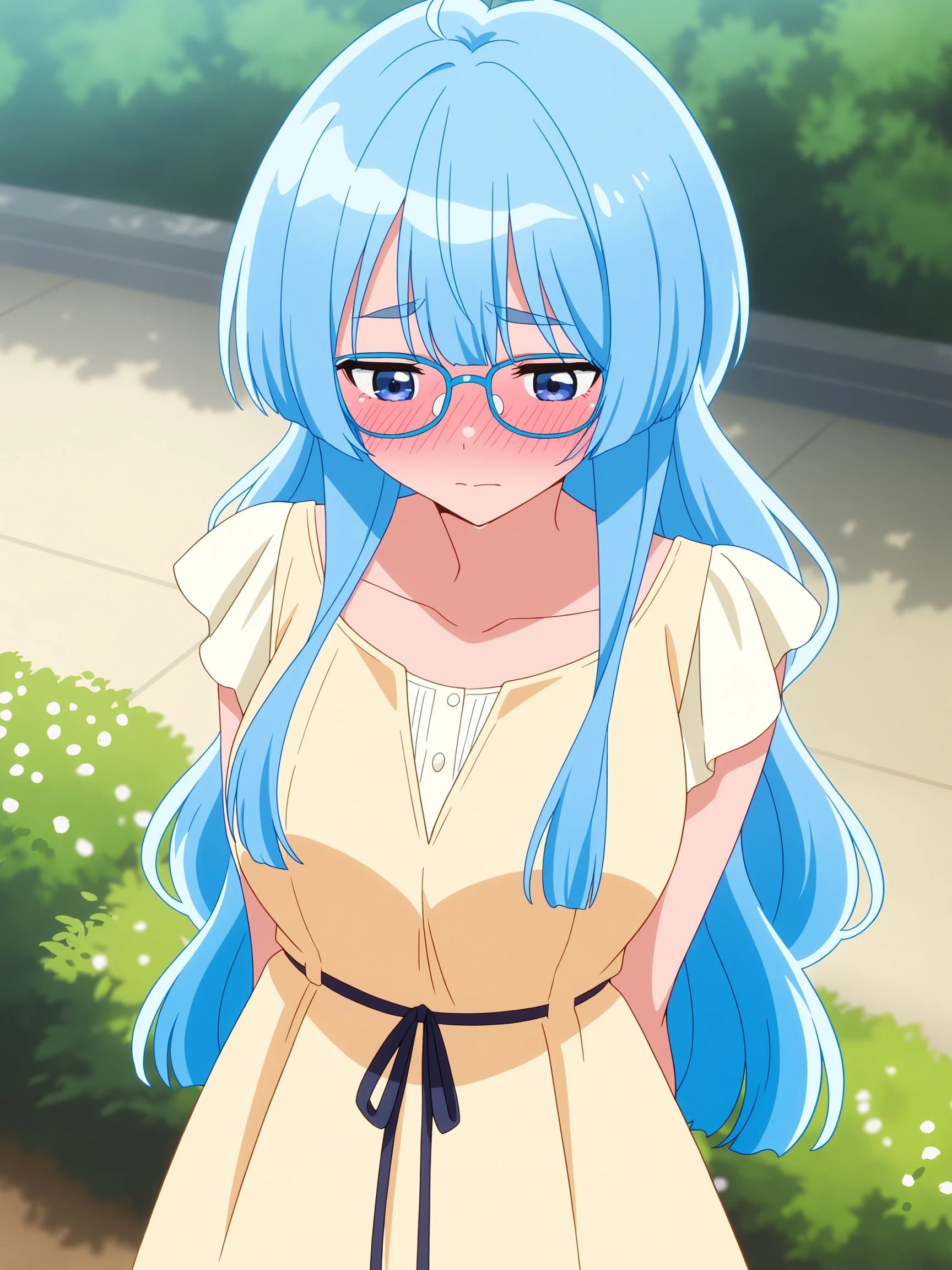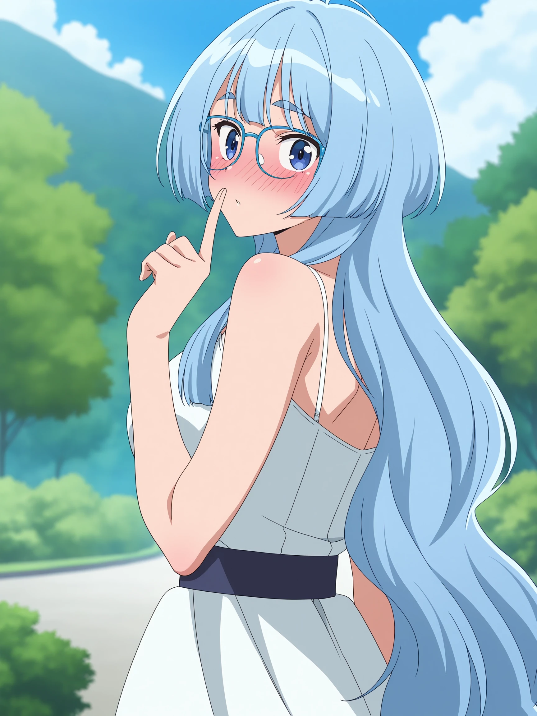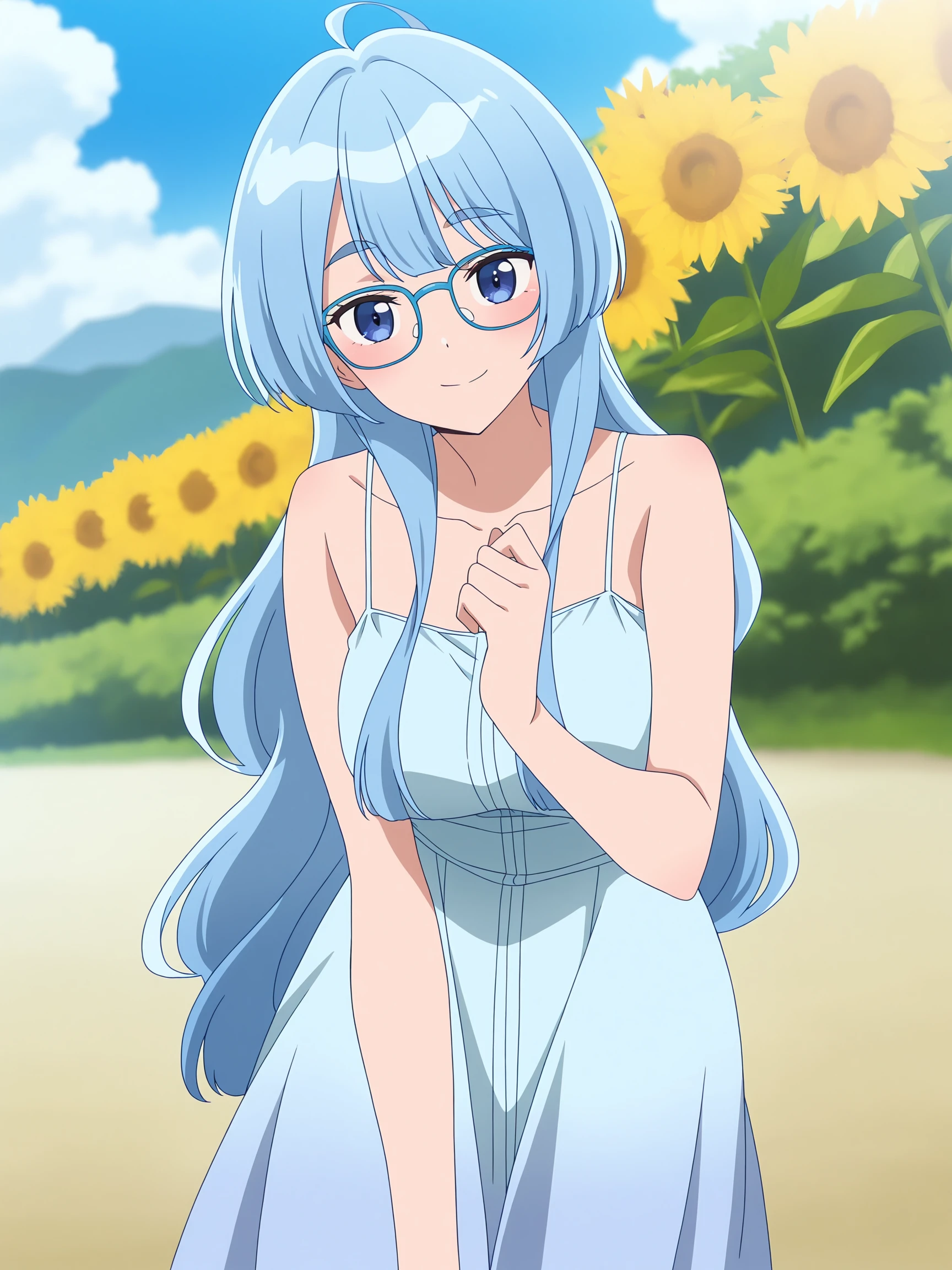 1girl, long hair, bangs, blue eyes, blue hair, glasses, seiha_shiunji,