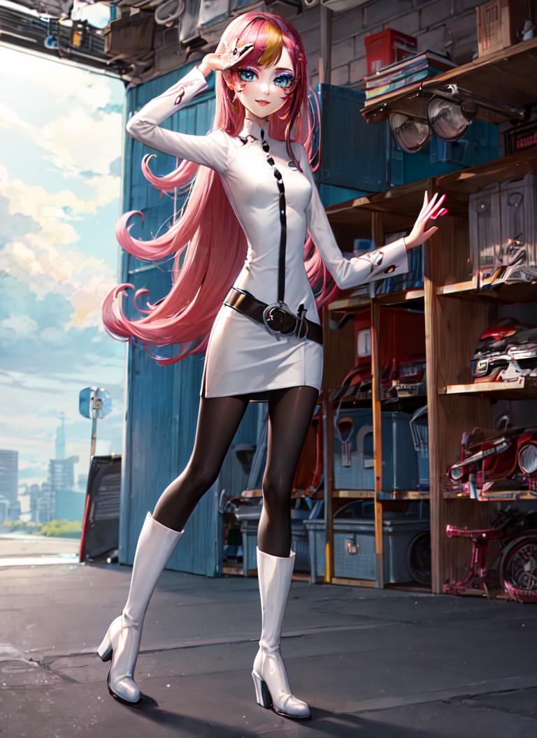 Default Outfit: short dress, long sleeves, black leggings, knee boots, belt