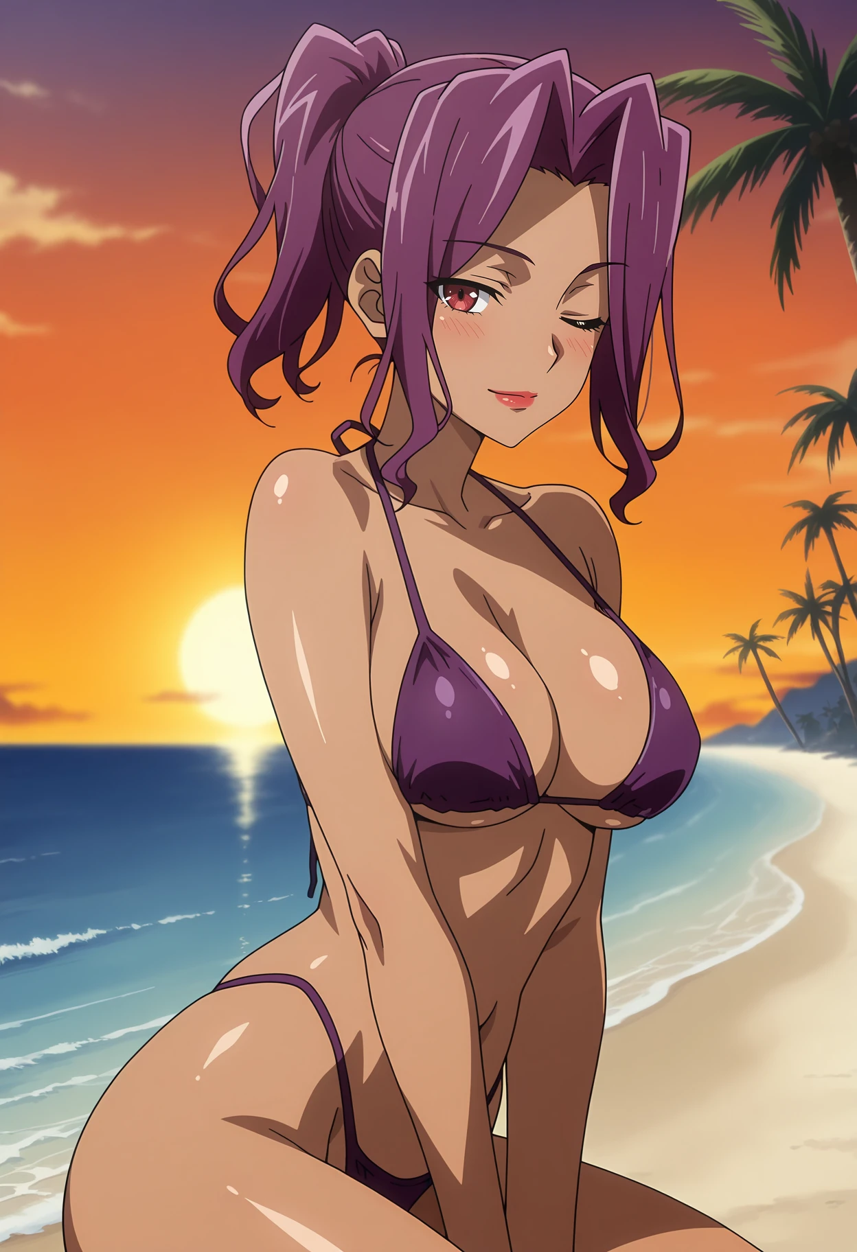 dark-skinned female, ponytail, parted bangs, hair intakes, short hair, purple hair, red eyes, lipstick