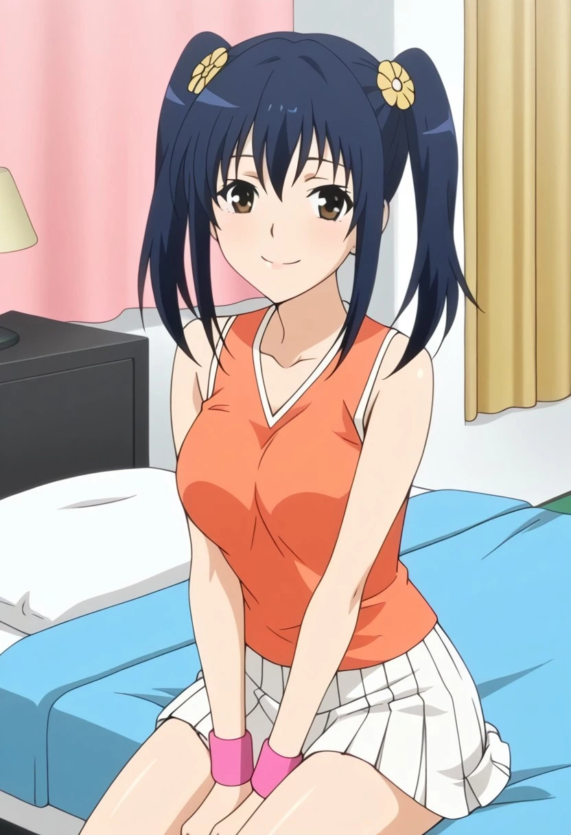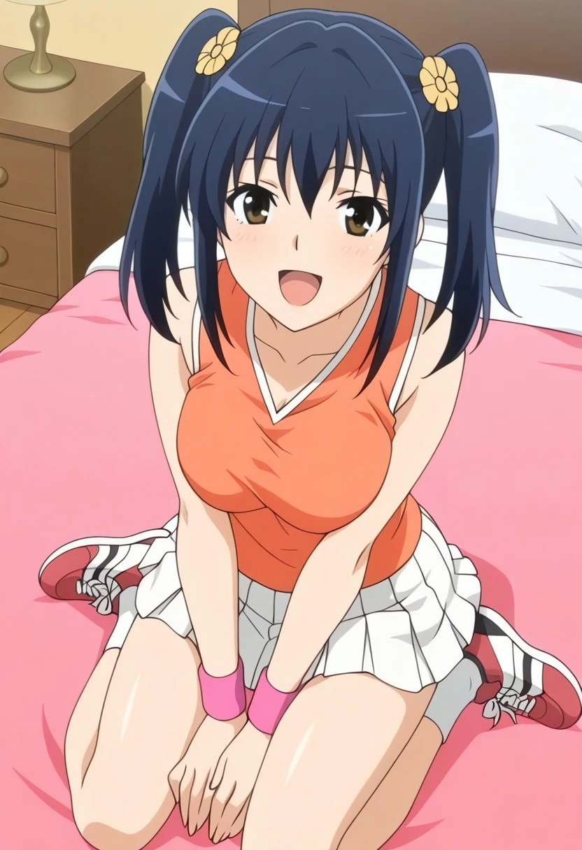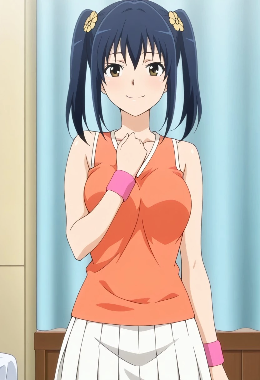 ayumi ep2 tennis outfit, tennis uniform, orange tank top, wristband, white skirt, pleated skirt, white socks, sneakers,