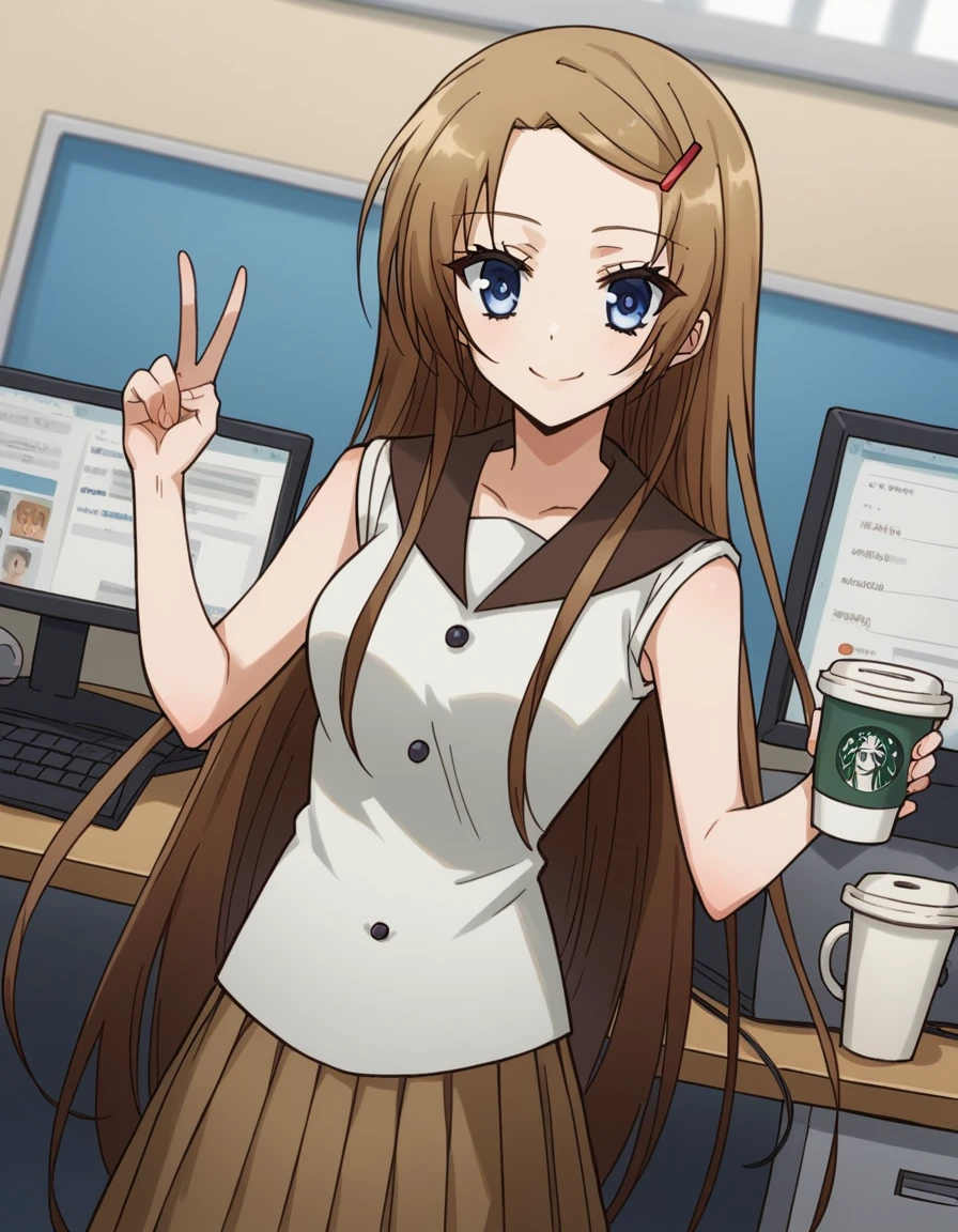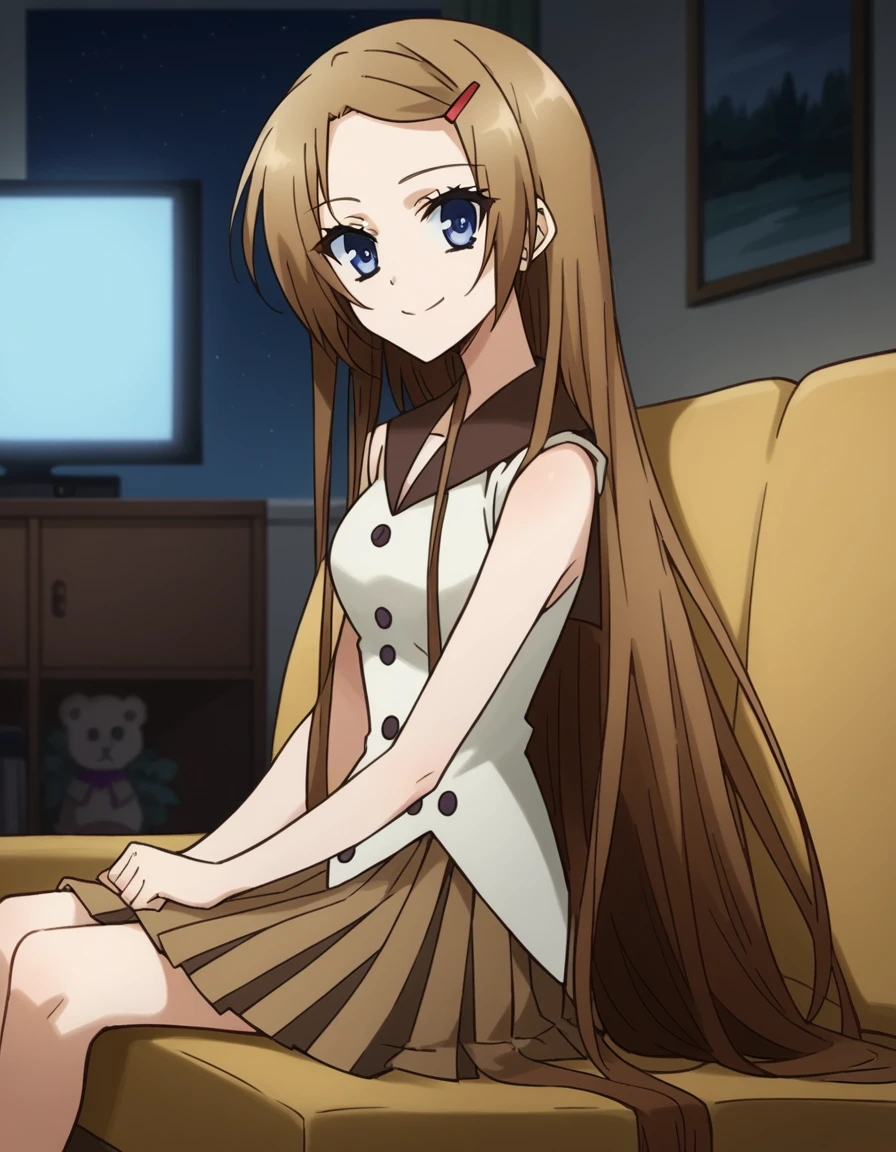 kanami mihara, long hair, brown hair, hair ornament, very long hair, blue eyes, hairclip, medium breasts,