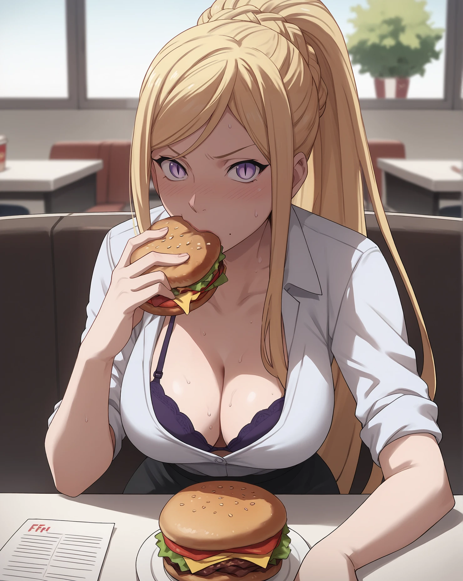 grey jacket, grey skirt, pleated skirt, belt, peaked cap, black bra