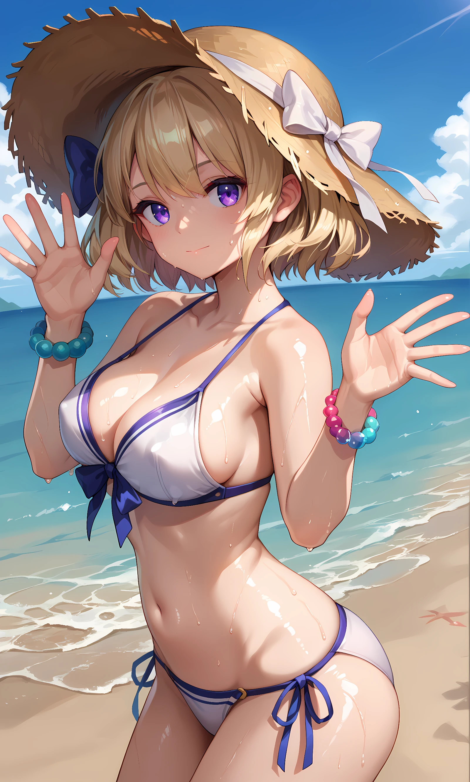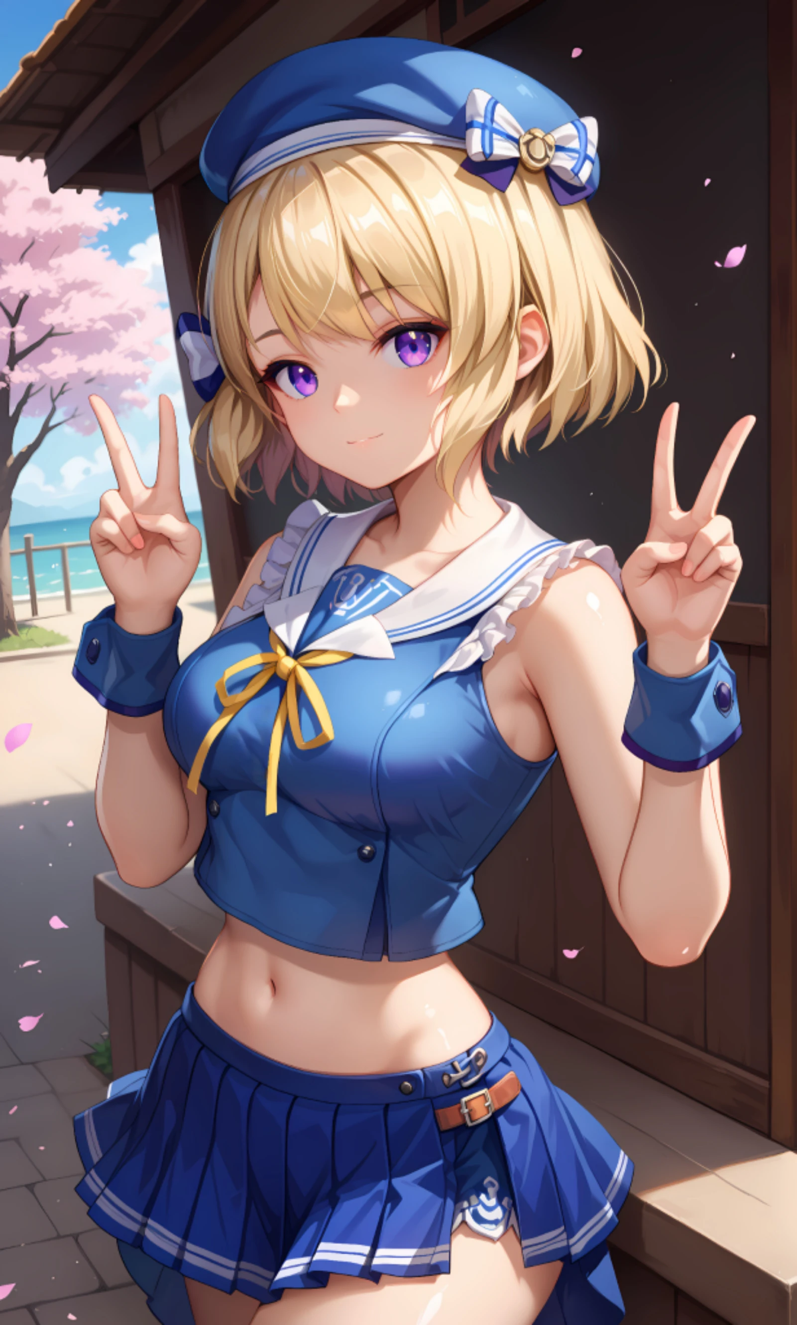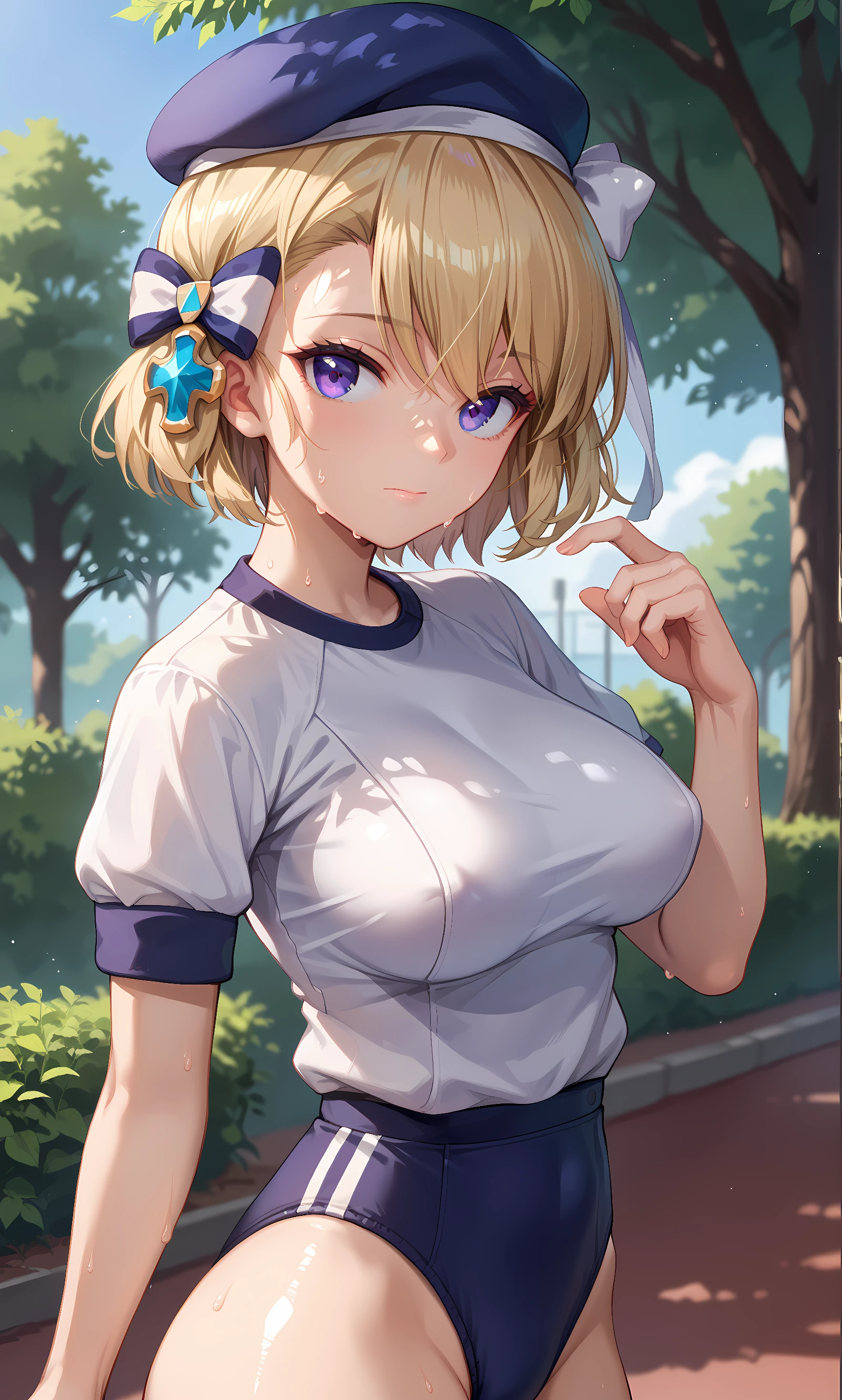 z23, purple eyes, short hair, bangs, hair ornament, blonde hair, hair between eyes, bow, hair bow, hat