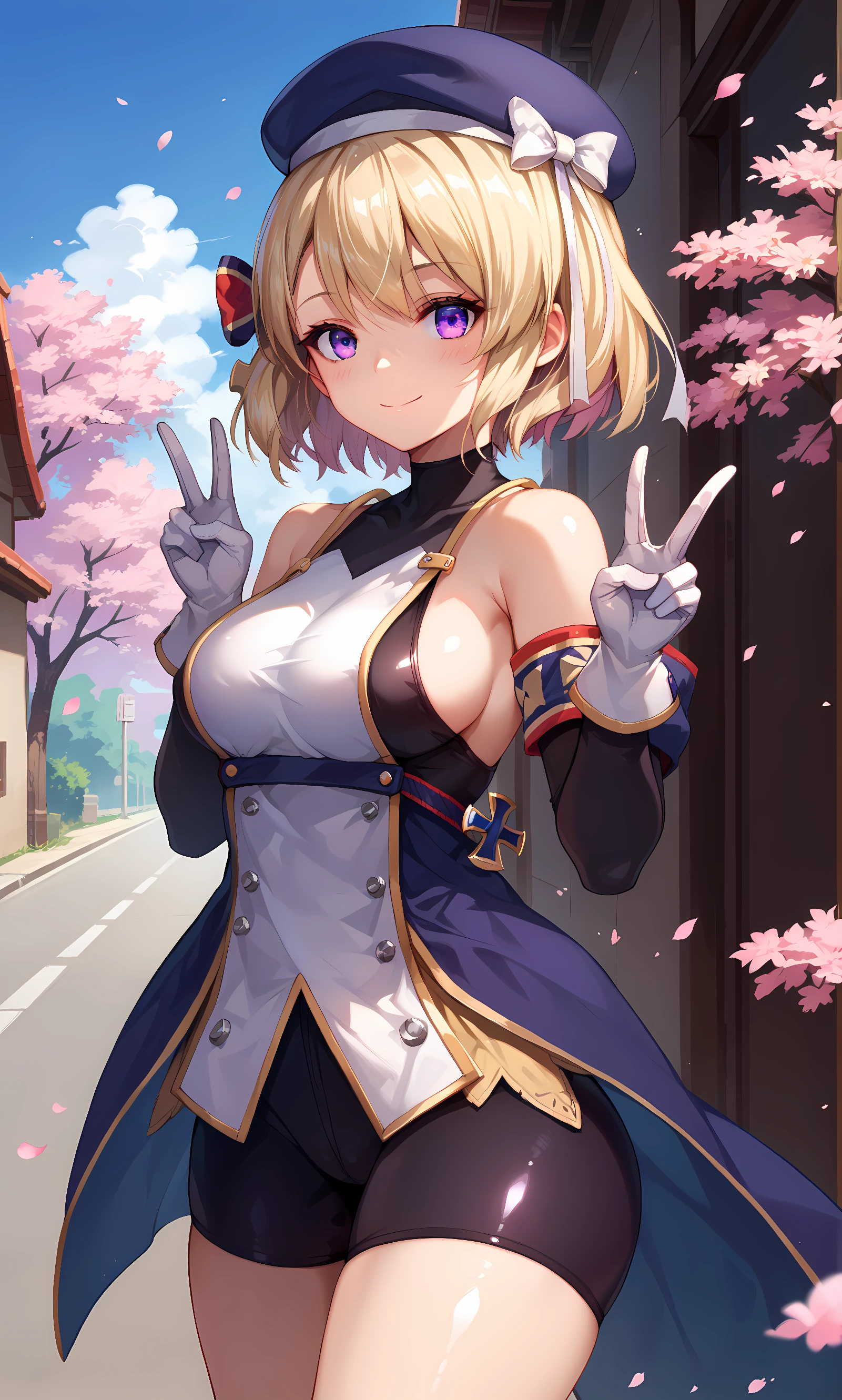 beret, bare shoulders, iron cross, white gloves, bike shorts, ribbon, detached sleeves, sideboob, black shorts, double-breasted, sleeveless, armband