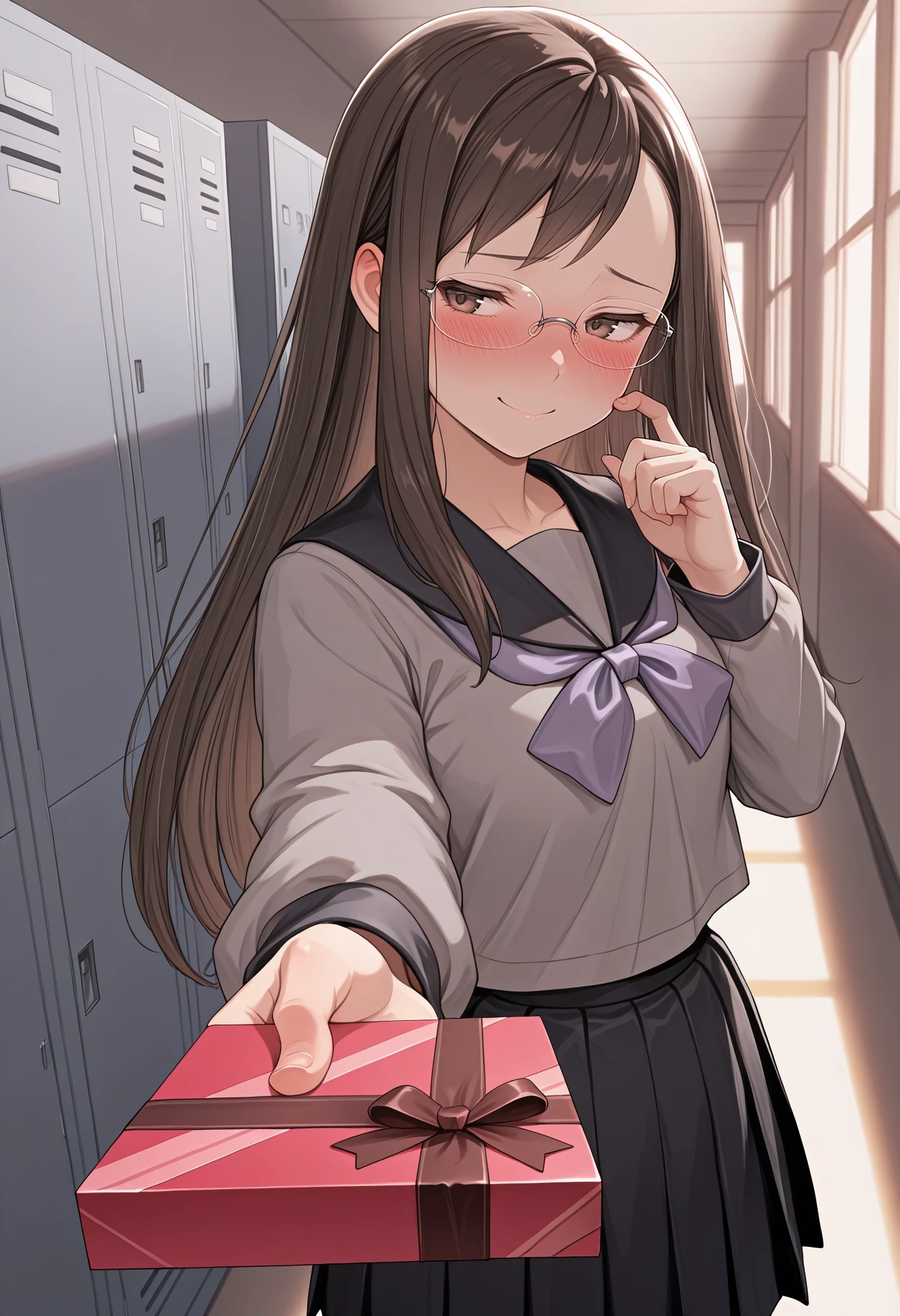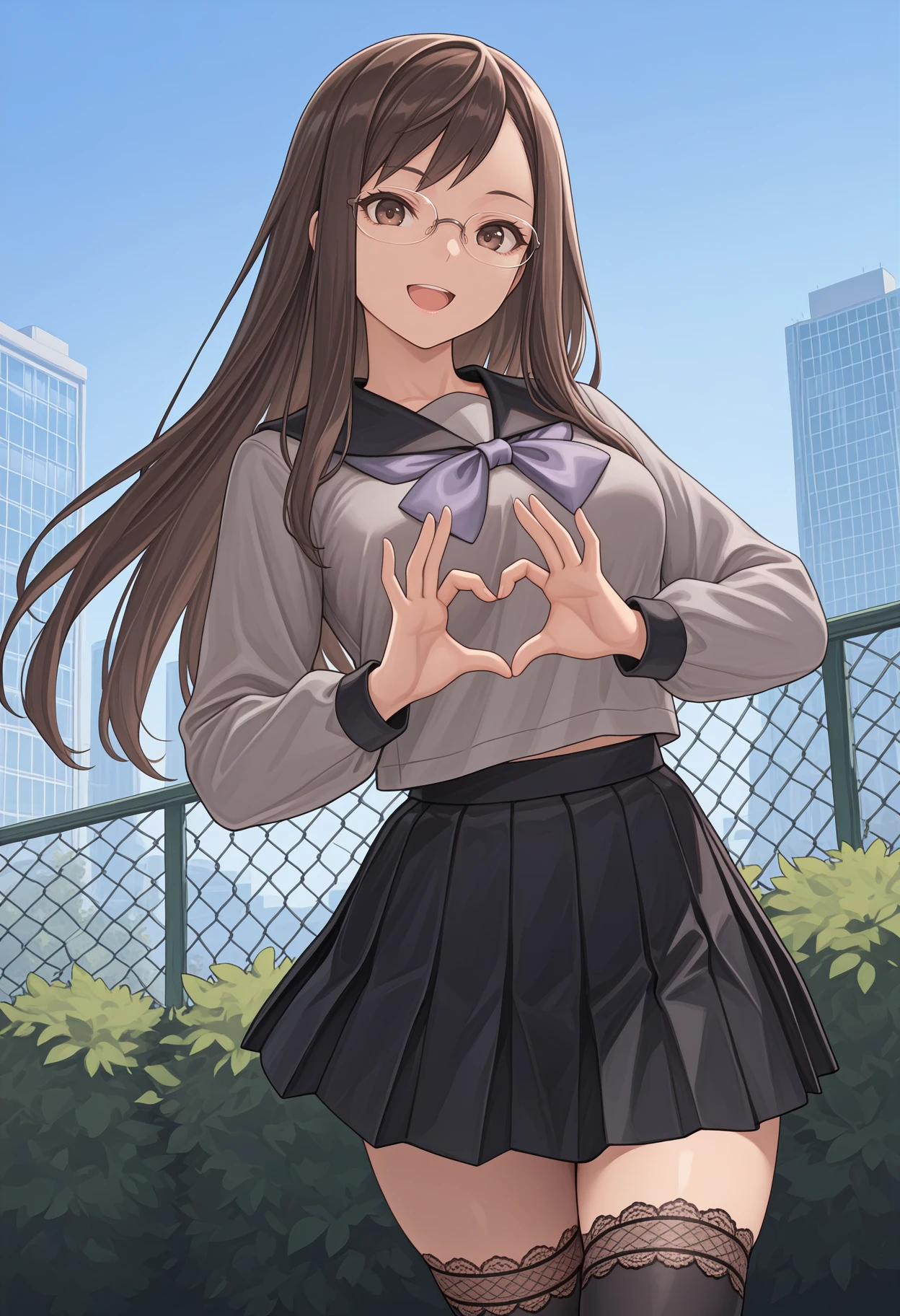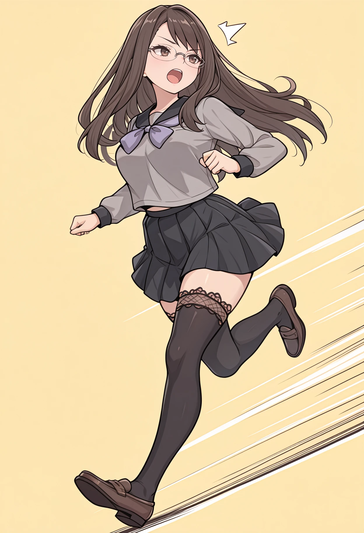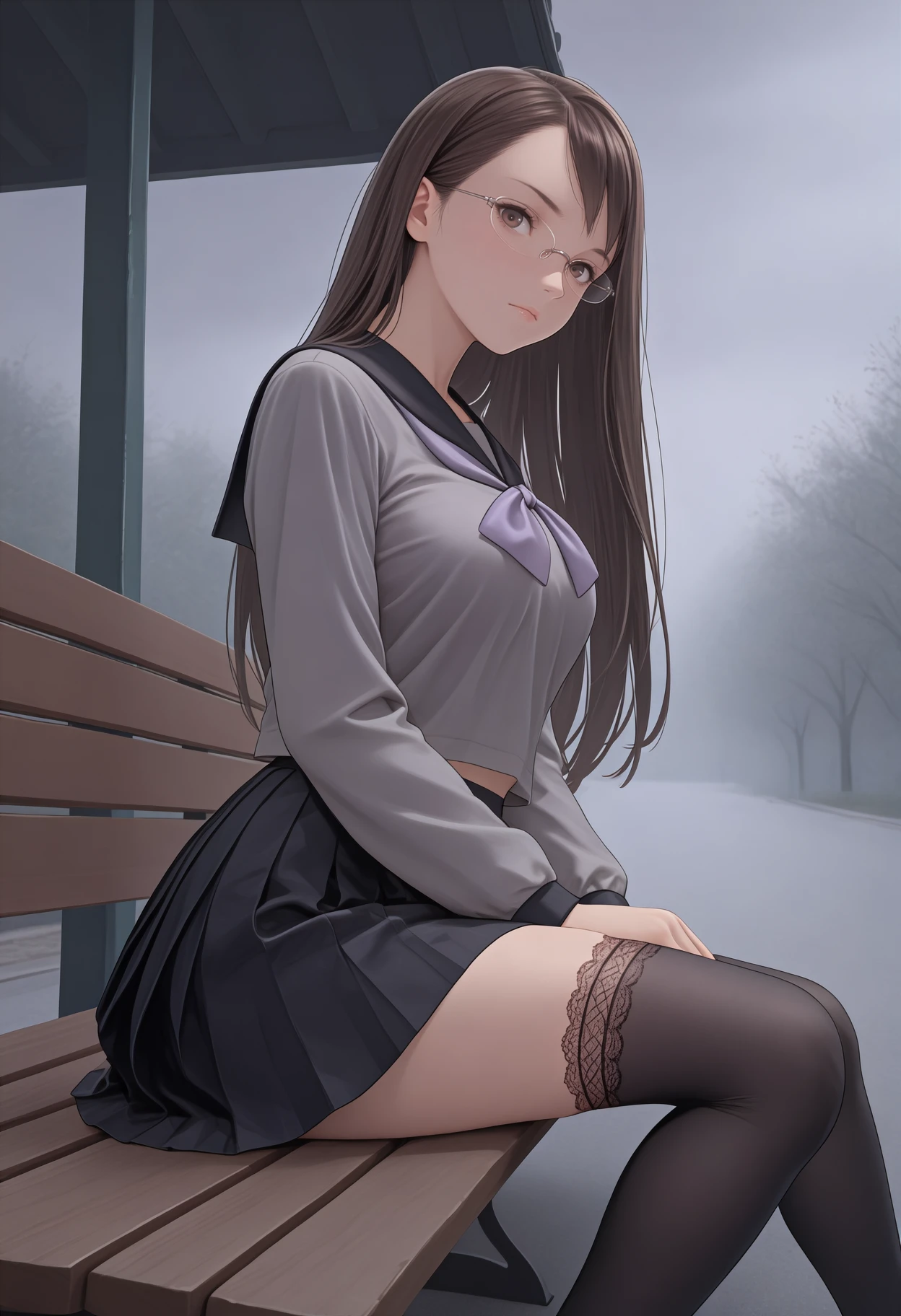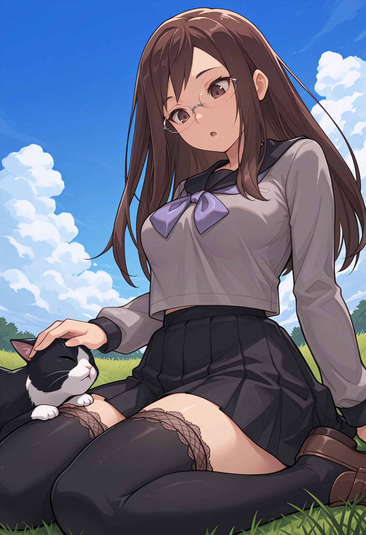 brown hair, brown eyes, long hair, glasses, rimless eyewear, grey shirt, black sailor collar, purple neckerchief, long sleeves, serafuku, black skirt, pleated skirt, black thighhighs, lace-trimmed thighhighs, loafers, brown footwear