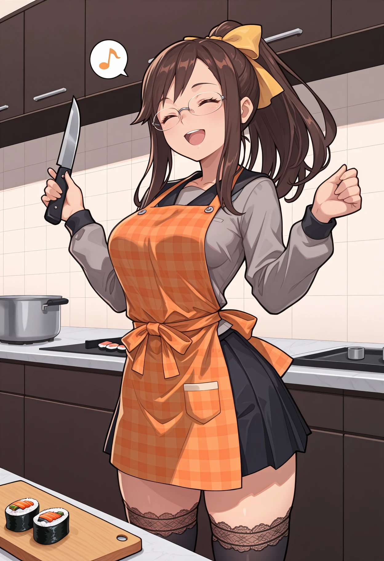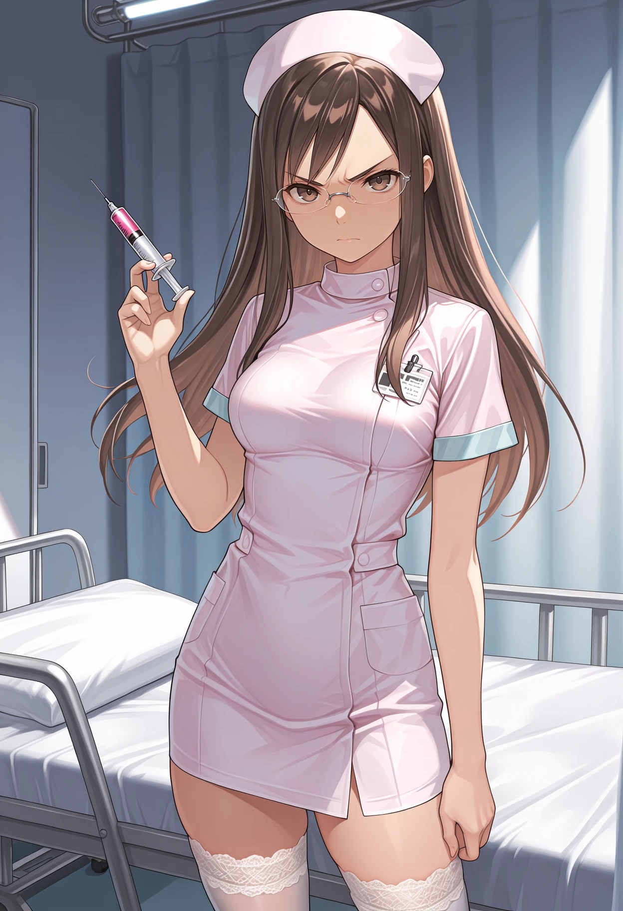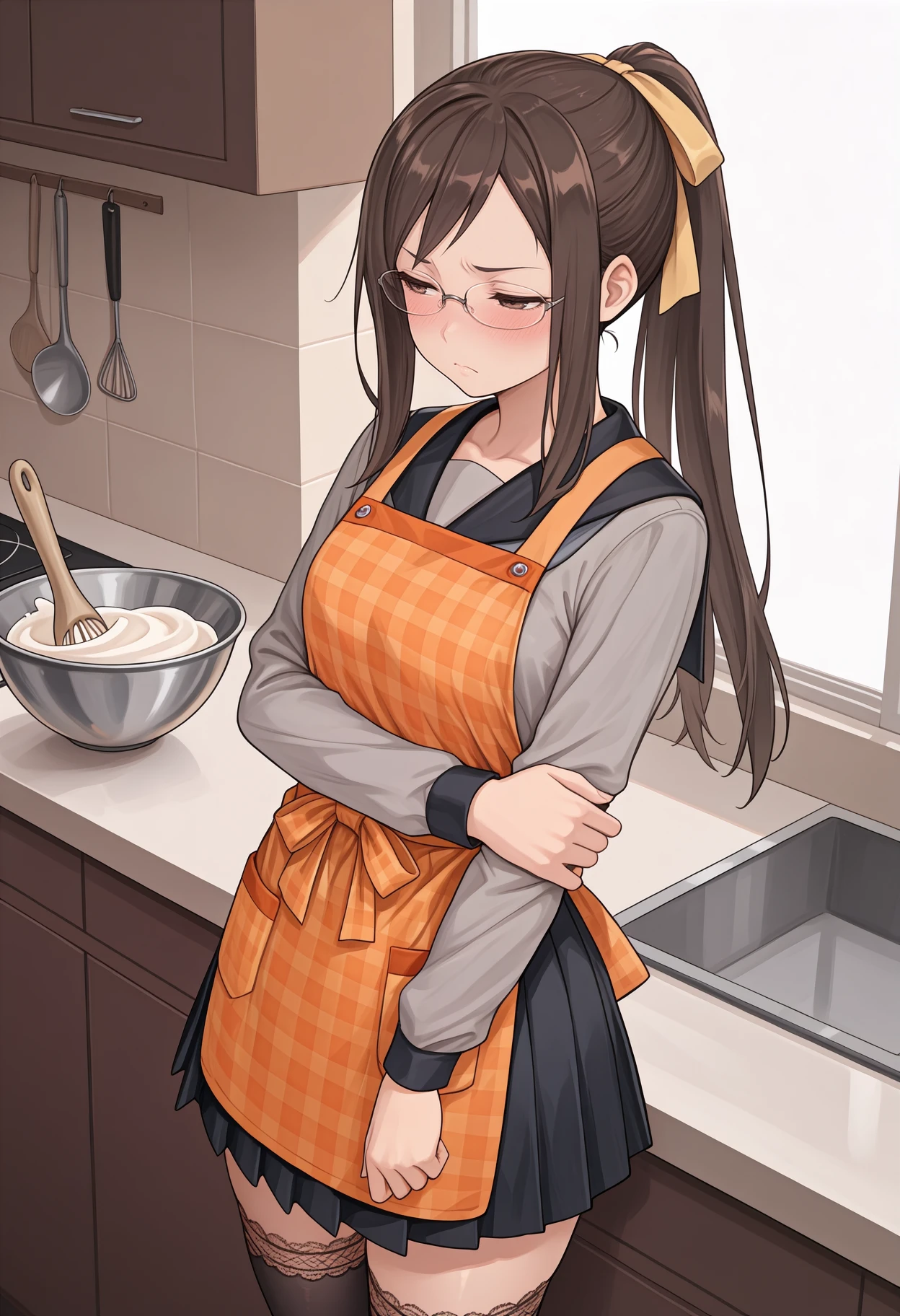 Default appearance: brown hair, brown eyes, long hair, glasses, rimless eyewear, grey shirt, black sailor collar, purple neckerchief, long sleeves, serafuku, black skirt, pleated skirt, black thighhighs, lace-trimmed thighhighs, loafers, brown footwear