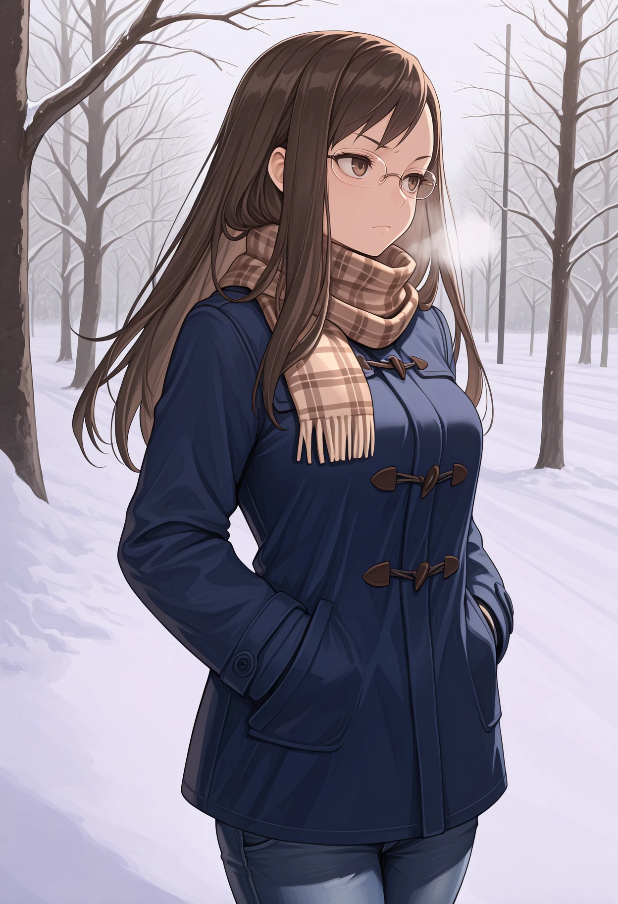 Custom outfit: brown hair, brown eyes, long hair, glasses, rimless eyewear