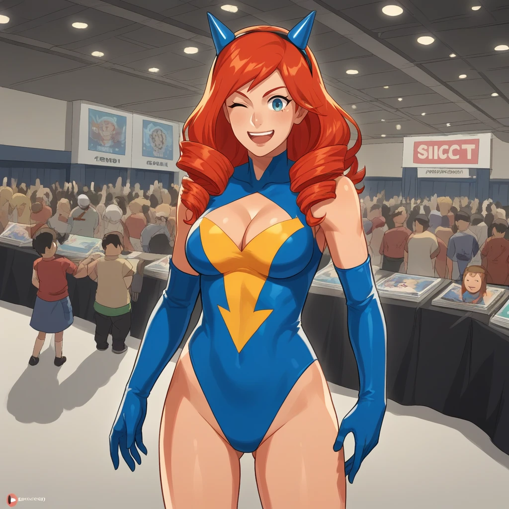 Optional: comic convention, crowd, indoors, skylight