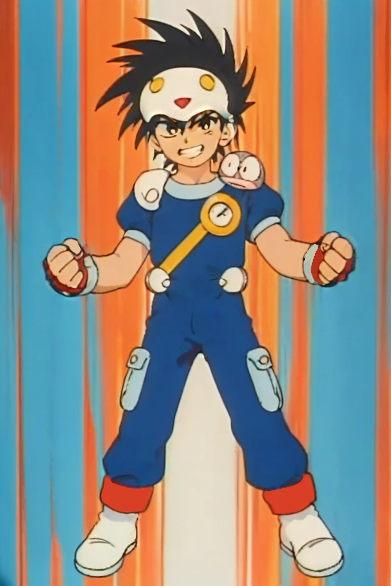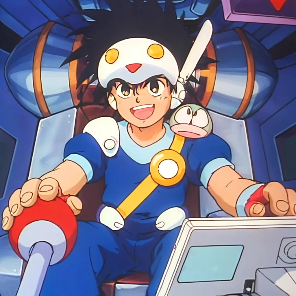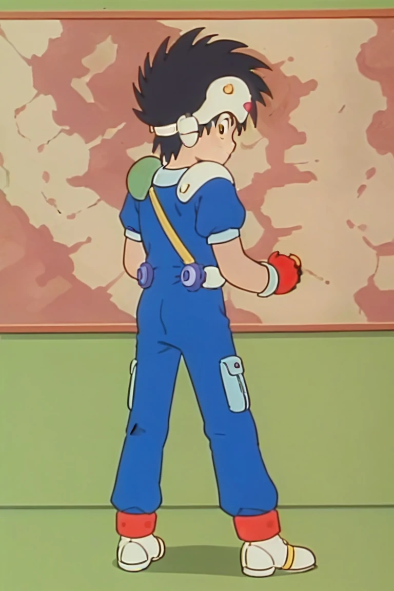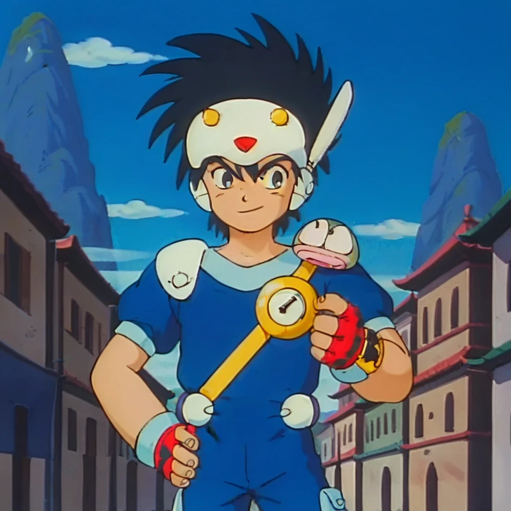 Prompts: male, black hair, spiked hair, headgear, black eyes, bodysuit, puffy short sleeves, fingerless gloves, indoors (dungeon/brick wall), outdoors (castle/sky/cloud/tree), outdoors (town/blue sky/mountains/east Asian architecture), ship interior/wooden floor/window/map (object), cockpit/computer/lever(s)