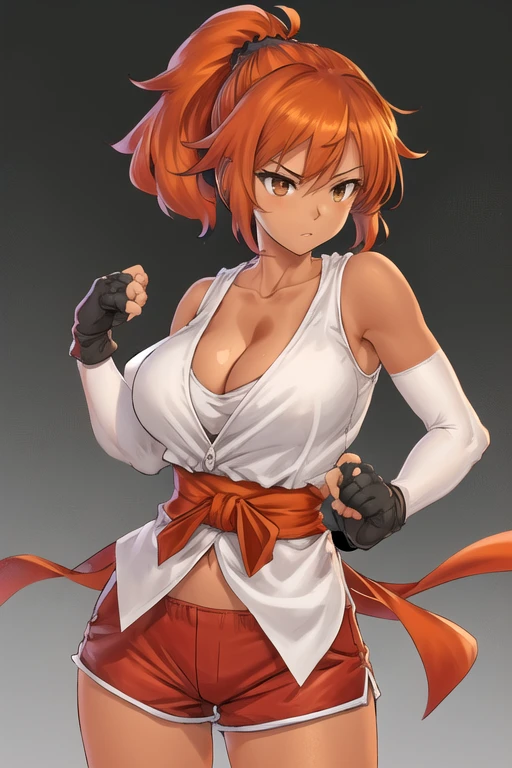 RedBattler, 1girl, solo, large breasts, black gloves, cleavage, bare shoulders, brown eyes, collarbone, ponytail, red shorts, elbow gloves, tan skin, fingerless gloves, orange hair, red sash, scrunchie, white dougi