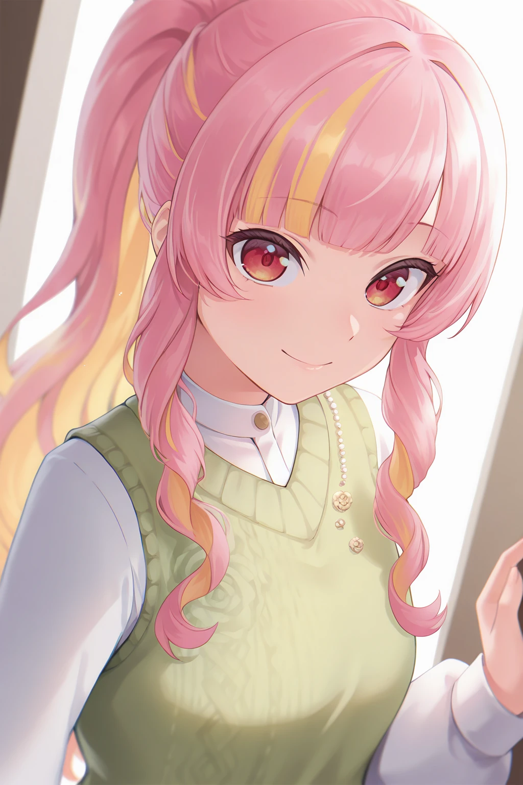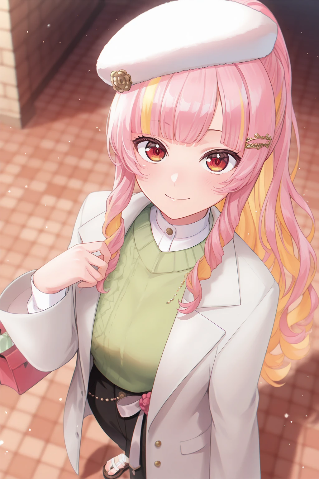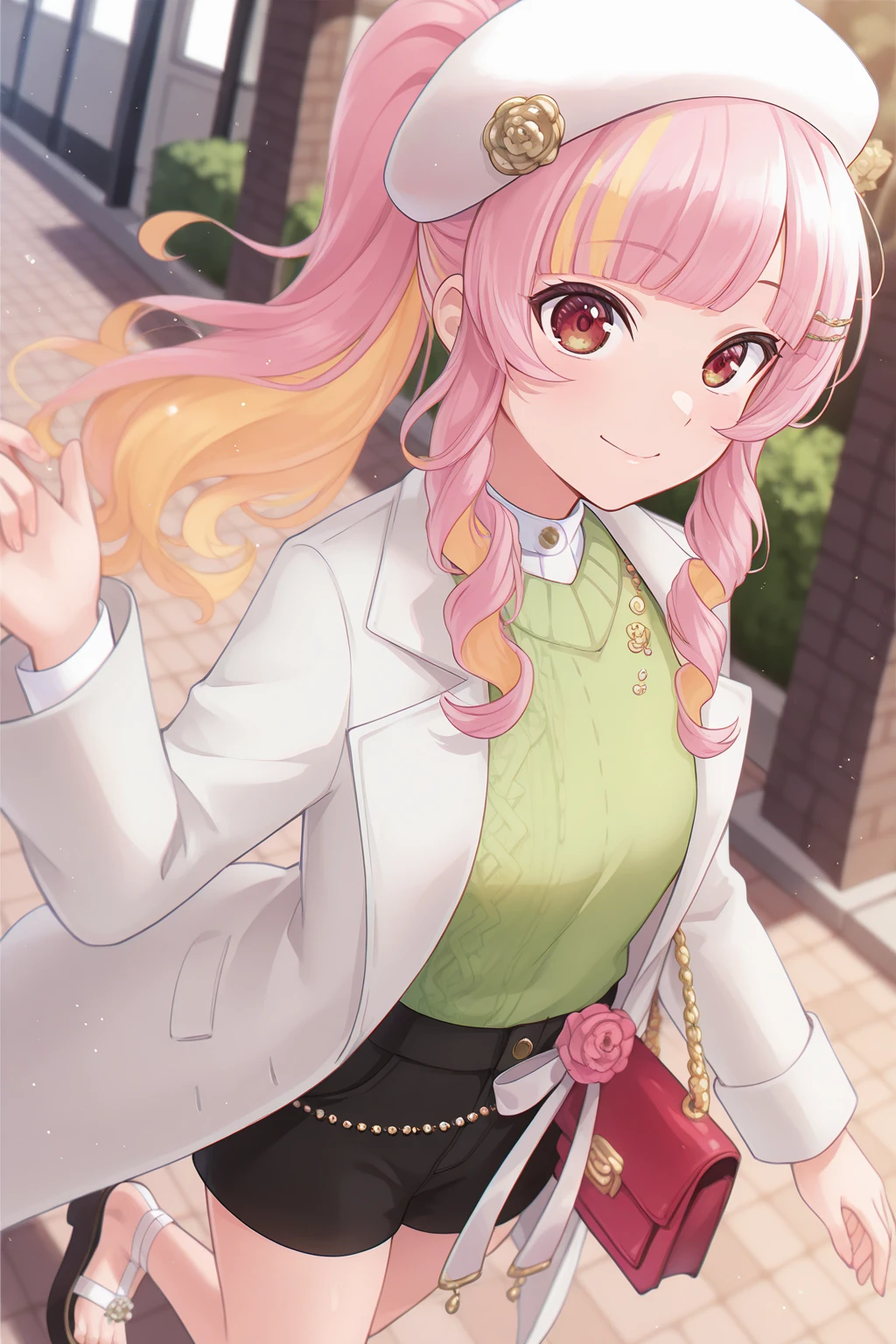RL3rdHairstyle, RL3rdCostume, long hair, pink hair, multicolored hair, drill sidelocks, high ponytail, red eyes, white headwear, hat ornament, hairclip, white coat, long sleeves, green sweater, lapels, black shorts, toeless footwear