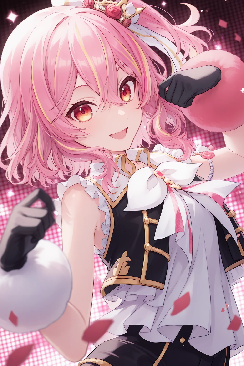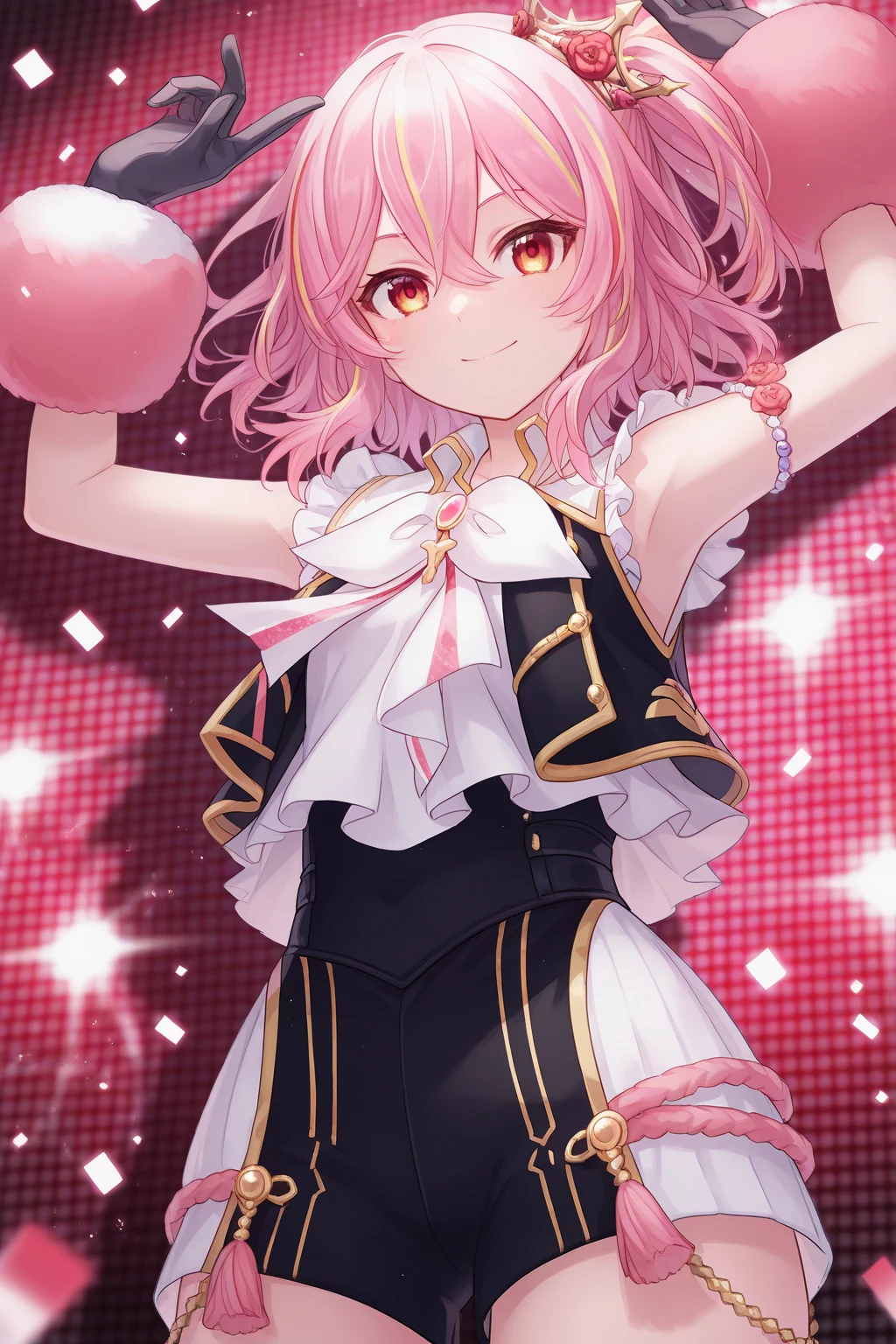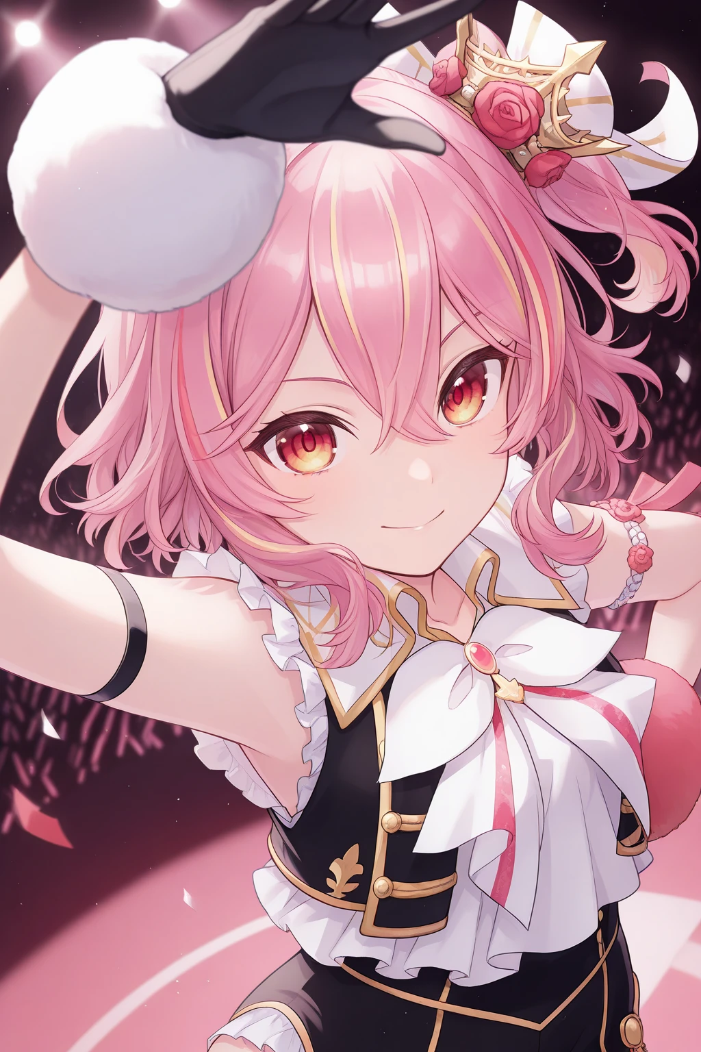 RLIdolHairstyle, RLIdolCostume, medium hair, pink hair, short sidetail, multicolored hair, red eyes, idol, mini crown, red rose, vest, sleeveless, white bowtie, armband, black gloves, asymmetrical gloves, black shorts, kneehighs, black footwear