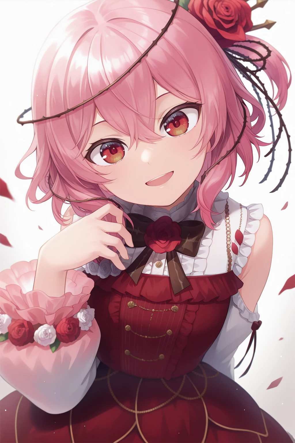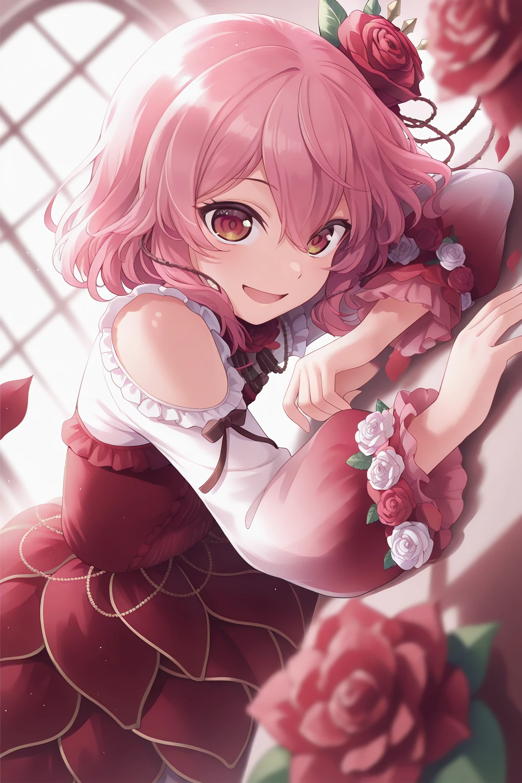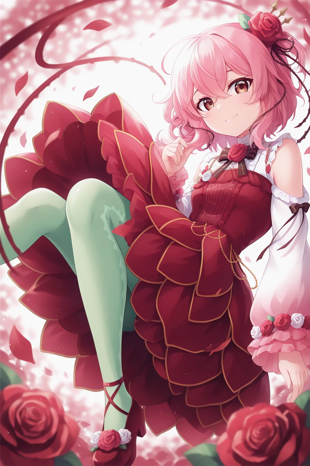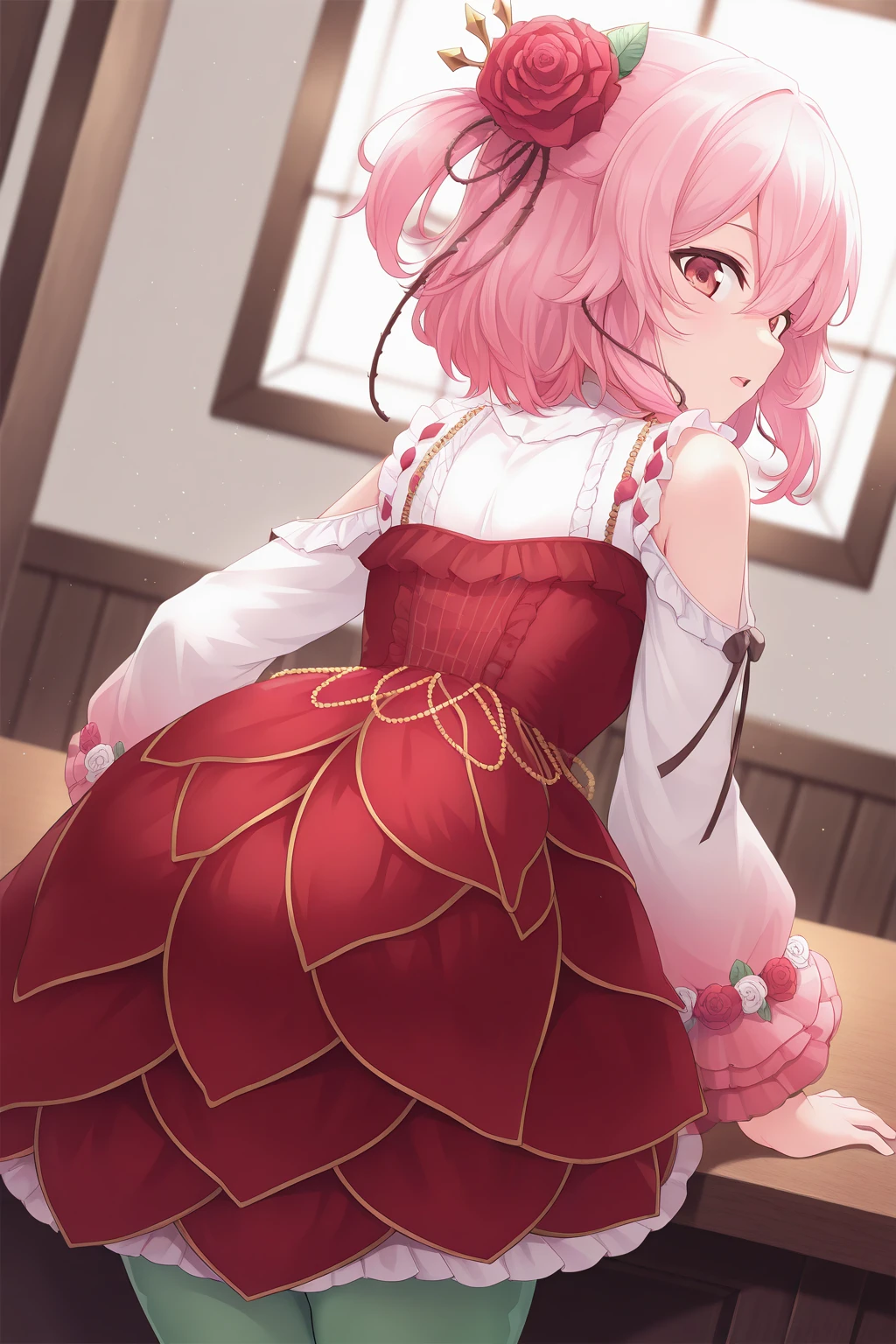 RL1stHairstyle, RL1stCostume, short hair, pink hair, red eyes, hair flower, red dress, shirt, shoulder cutout, puffy long sleeves, white rose, green pantyhose, high heels
