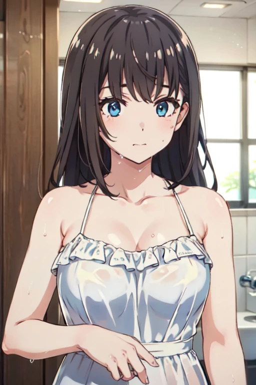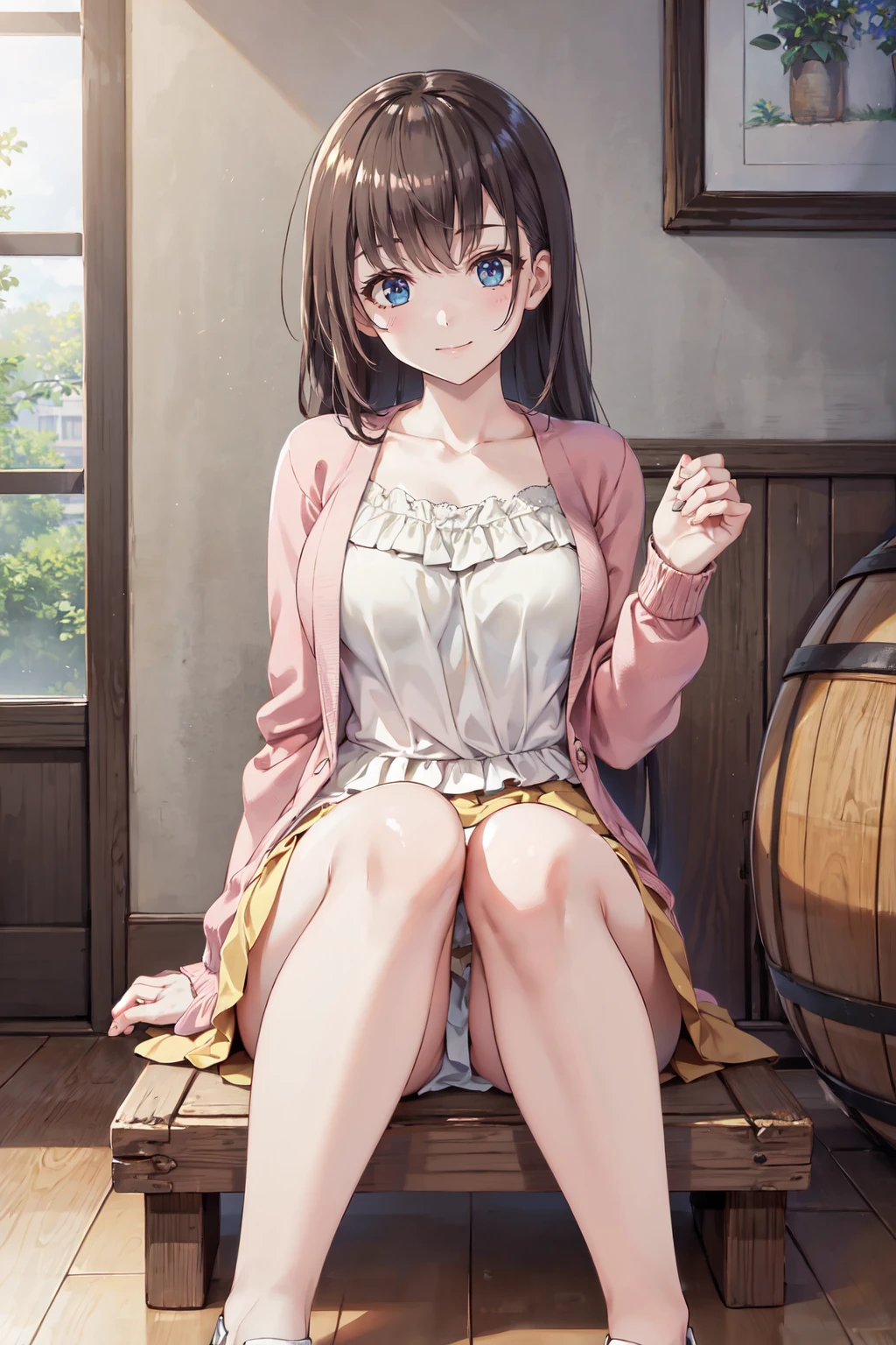 mio ikoma, long brown hair, blue eyes, open pink cardigan, white blouse underneath, yellow knee-length skirt, brown leather shoes