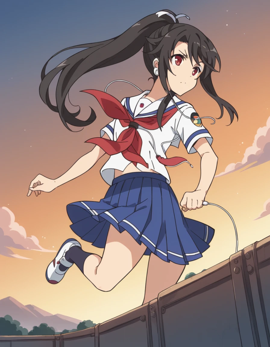 skirt, ribbon, school uniform, short sleeves, pleated skirt, serafuku, blue skirt, neckerchief, red neckerchief,