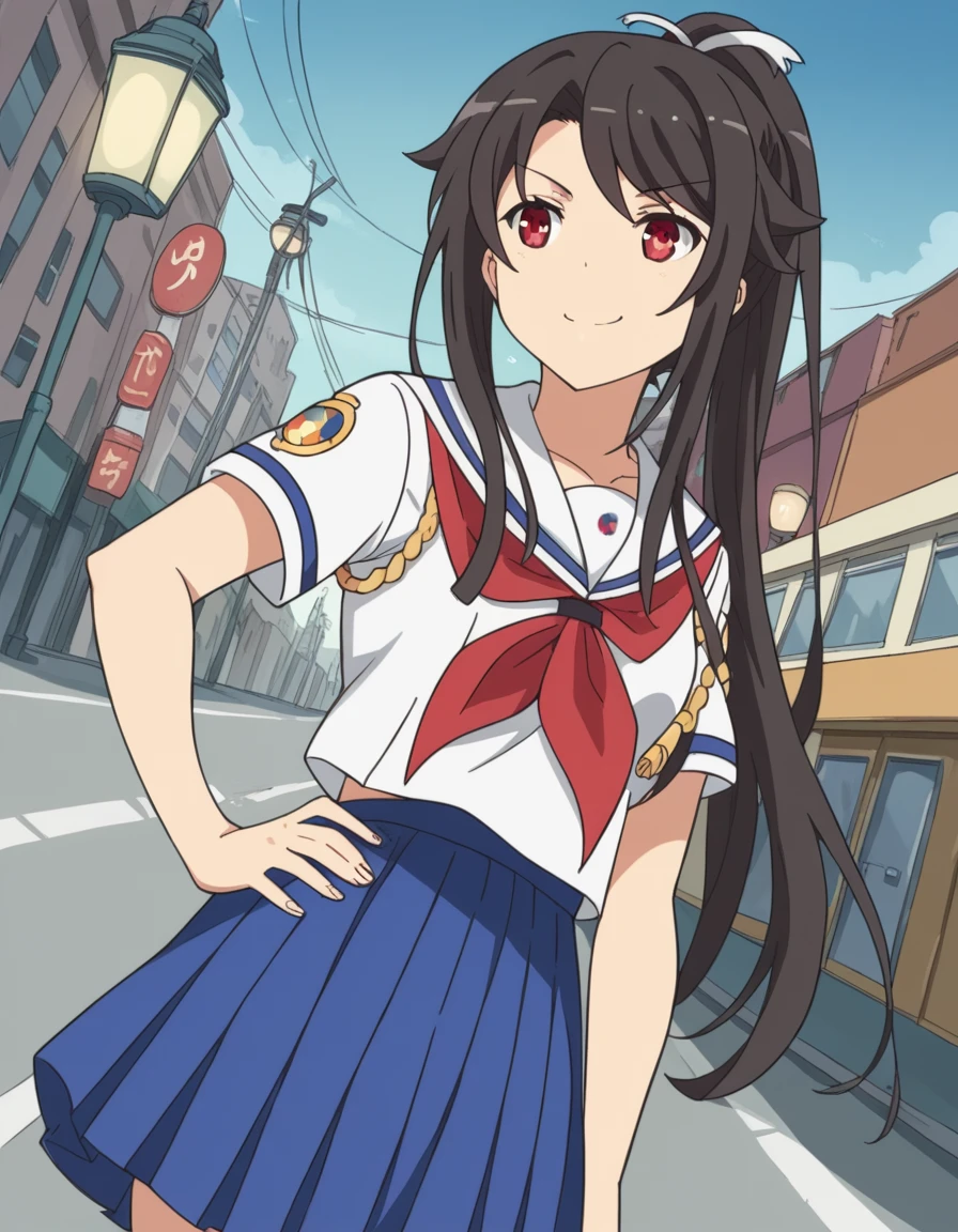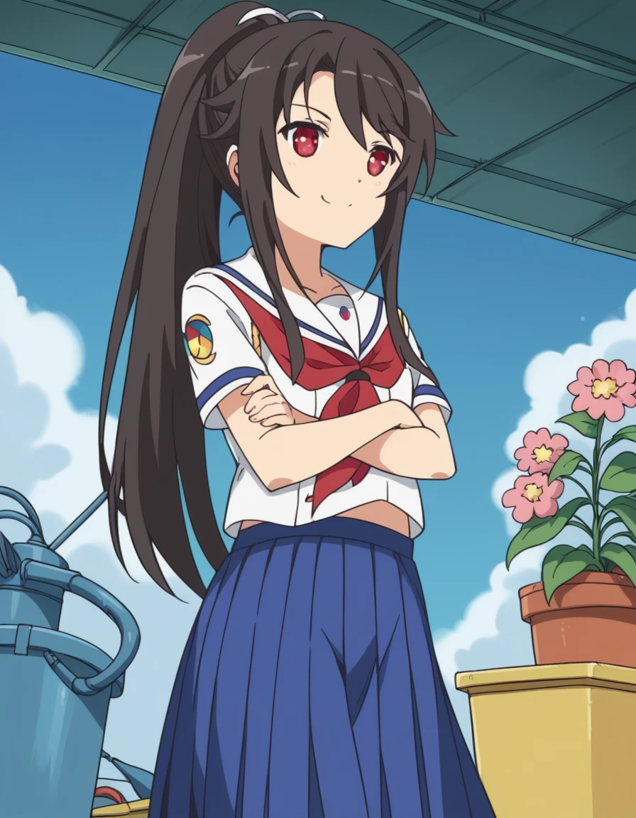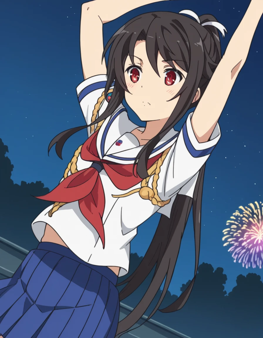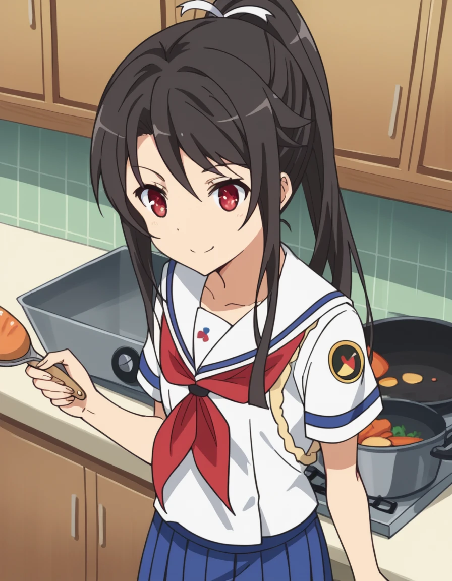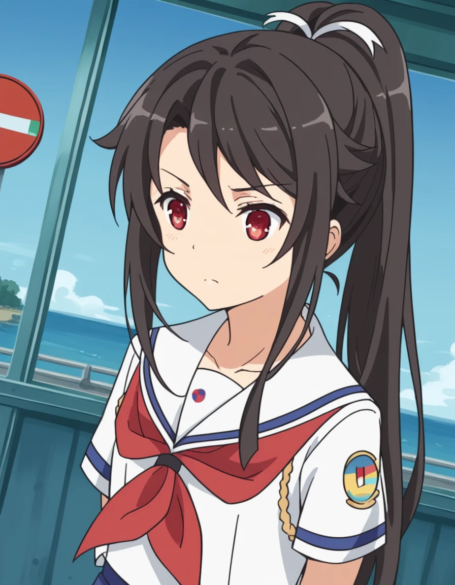 mashiro munetani, long hair, black hair, red eyes, hair ribbon, ponytail,