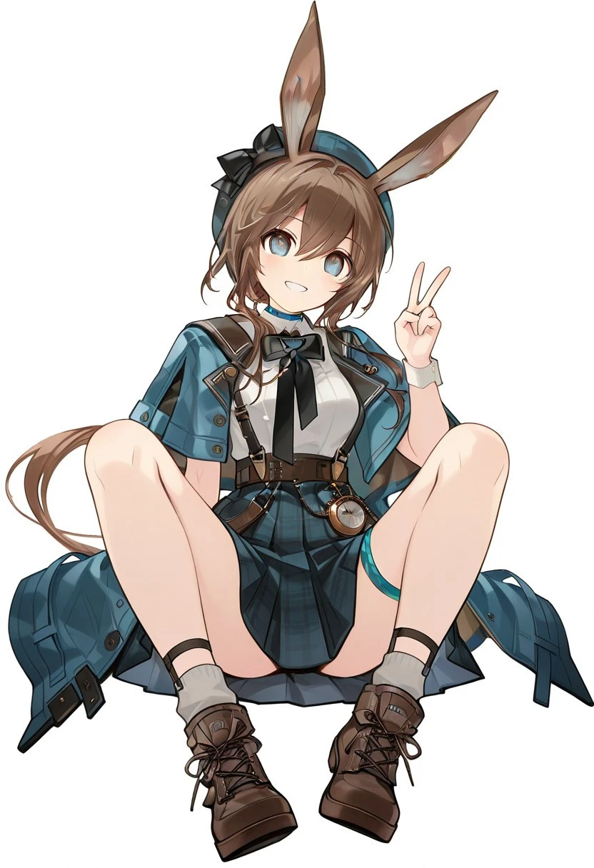 amiya,arknights,amiya(arknights),JR,blue eyes,brown hair,headwear,black bow,low long ponytail,white shirt,plaid skirt,coat,belt,pocket watch,thigh strap,garter socks,boots,ankle boots,