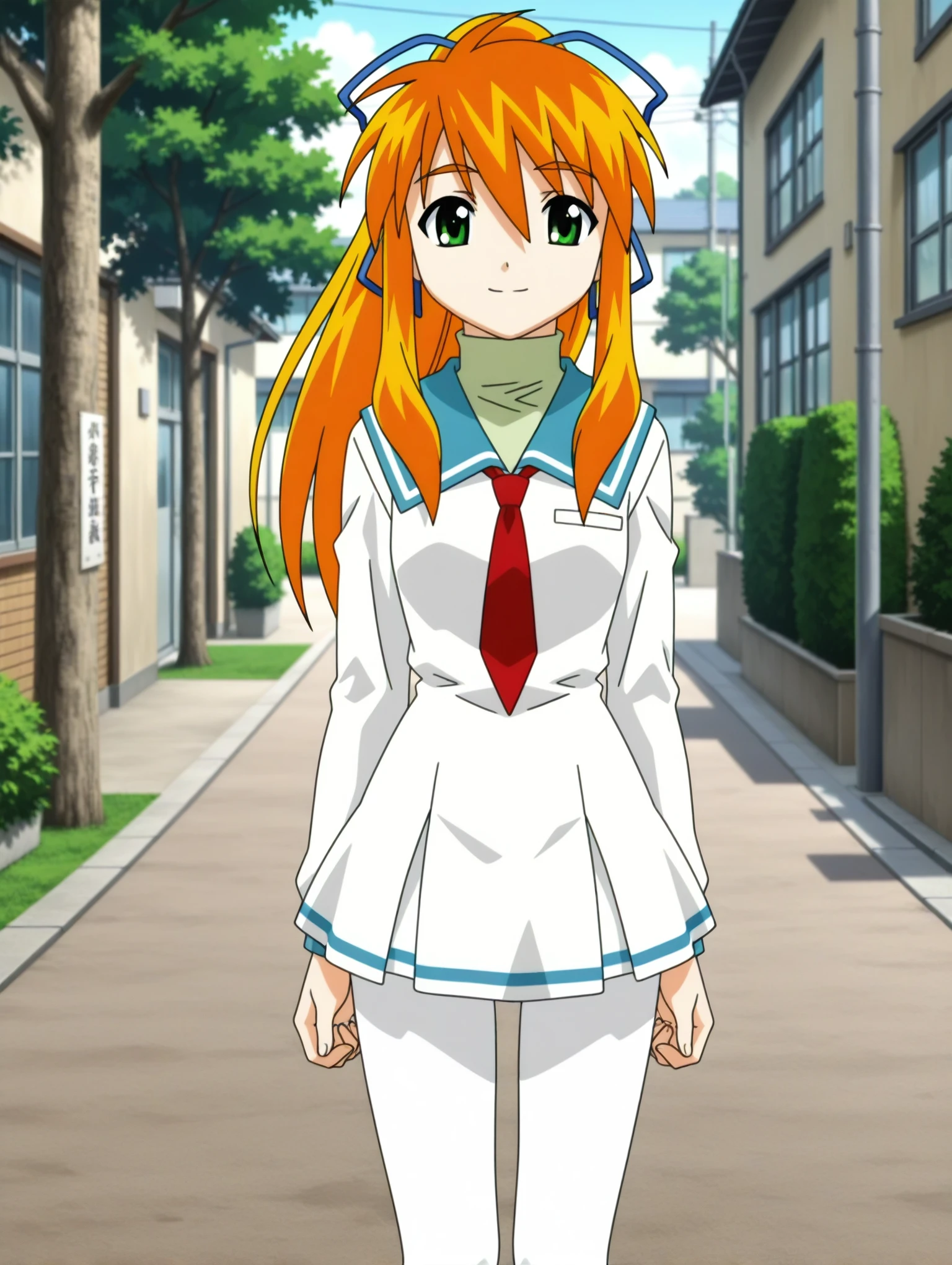 kitsunenoakane, green eyes, long hair, orange hair, sidelocks, ponytail, blue hair ribbon,