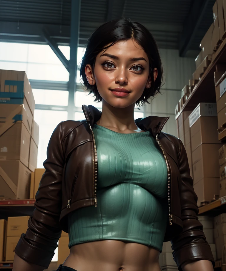 green shirt, leather jacket, midriff, navel, jeans, shoes,