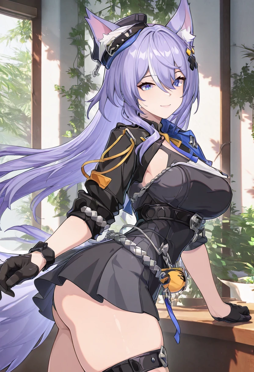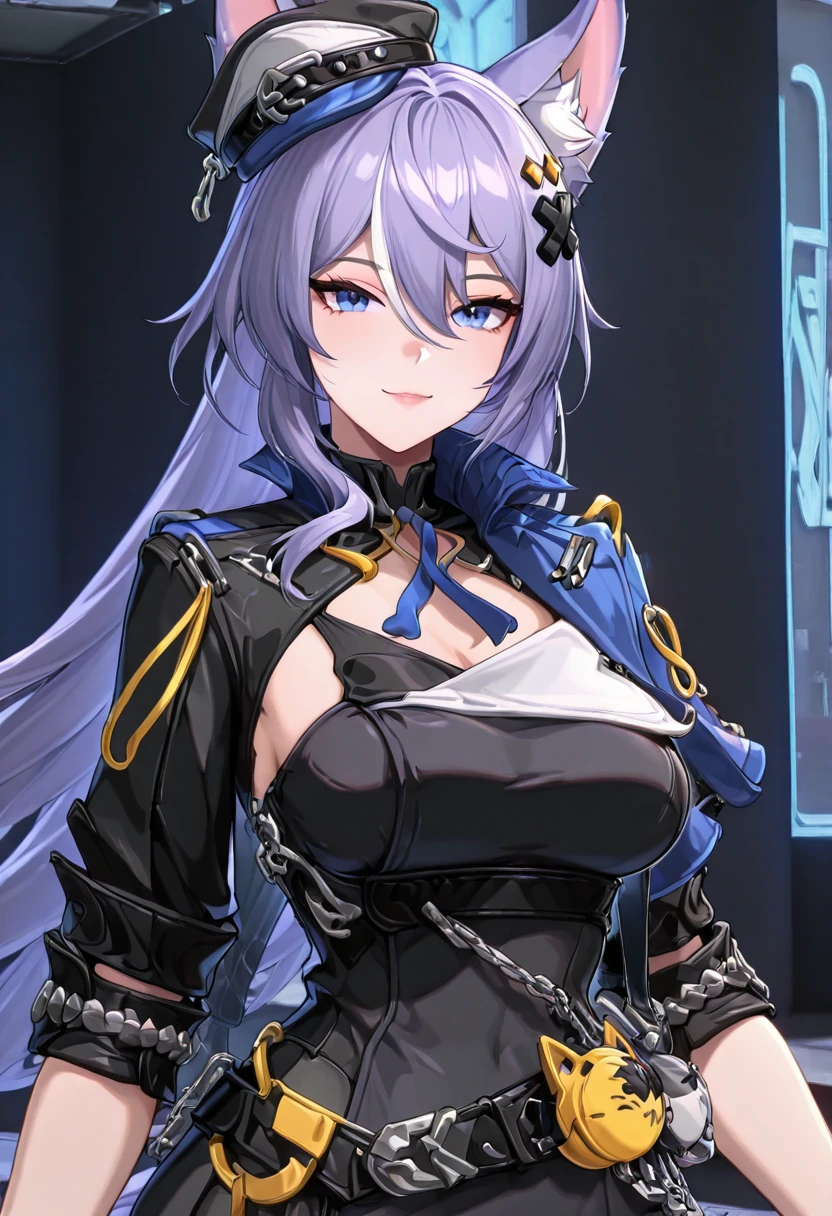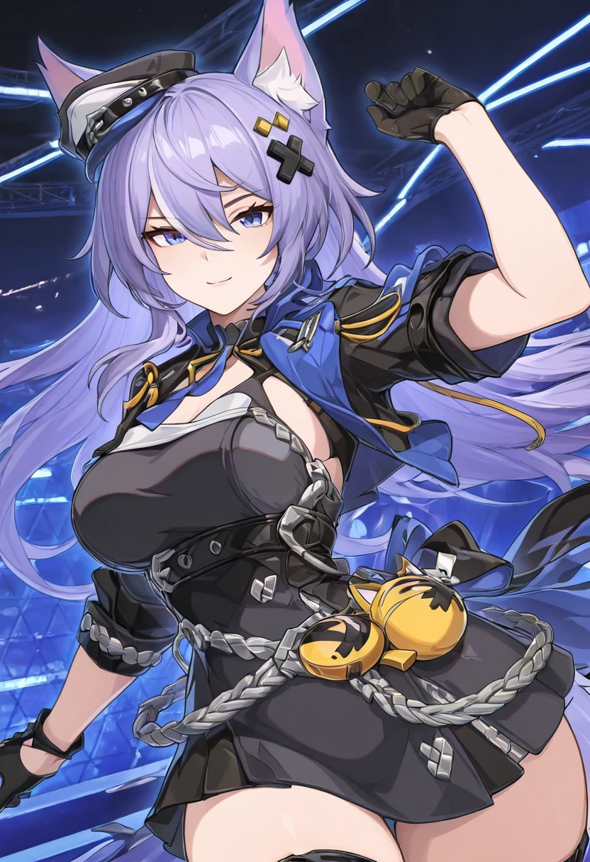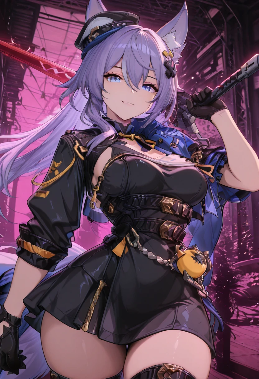 zzLykaia, blue eyes, purple hair, long hair, hair ornament, animal ears, fox ears, animal ear fluff, hair between eyes, gloves, hat, short dress, black dress, jacket, black gloves, belt, black headwear, cropped jacket,