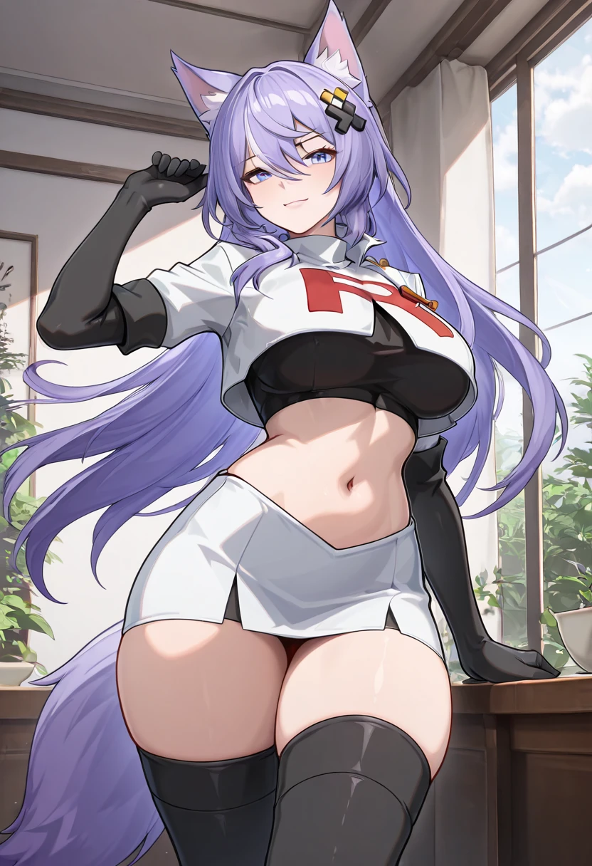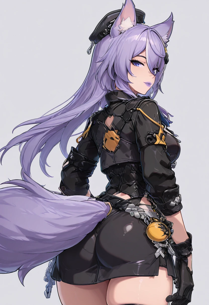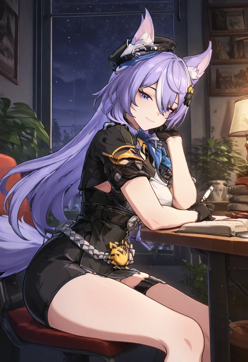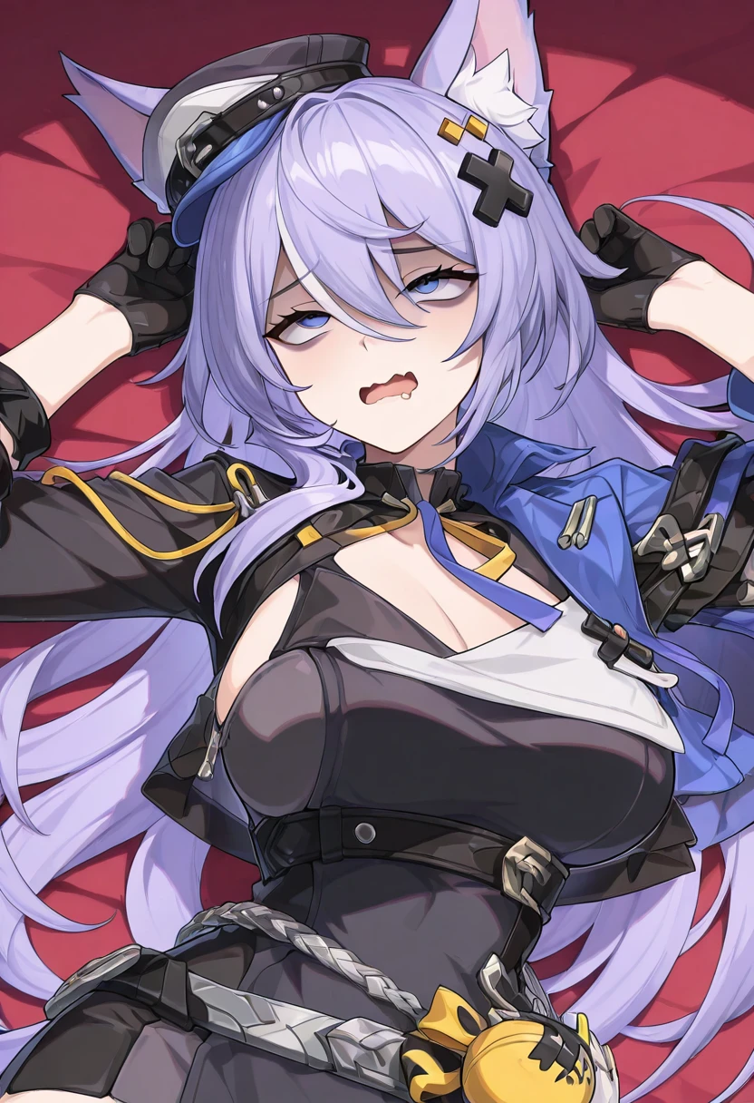 zzLykaia, blue eyes, purple hair, long hair, hair ornament, animal ears, fox ears, animal ear fluff, hair between eyes, gloves, hat, short dress, black dress, jacket, black gloves, belt, black headwear, cropped jacket,