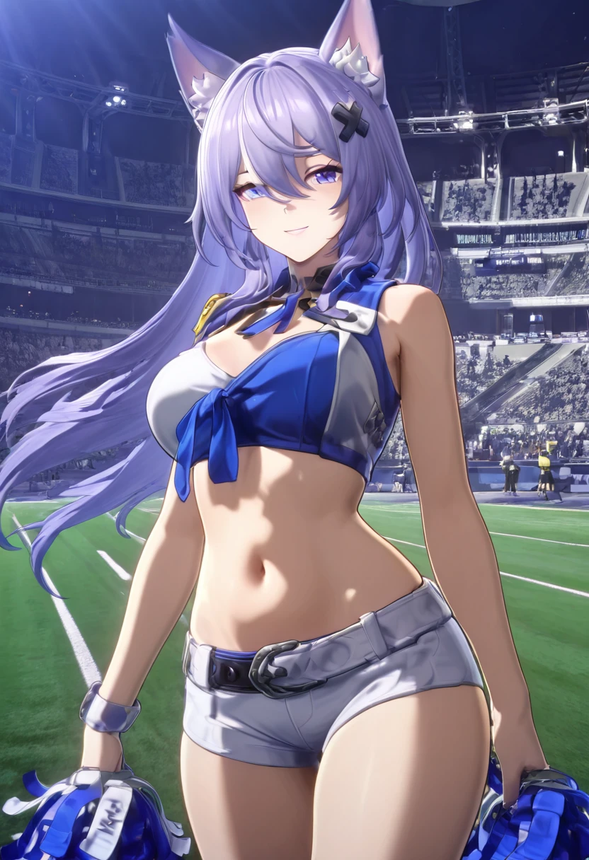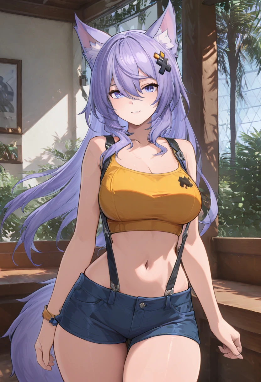 zzLykaia, blue eyes, purple hair, long hair, hair ornament, animal ears, fox ears, animal ear fluff, hair between eyes,