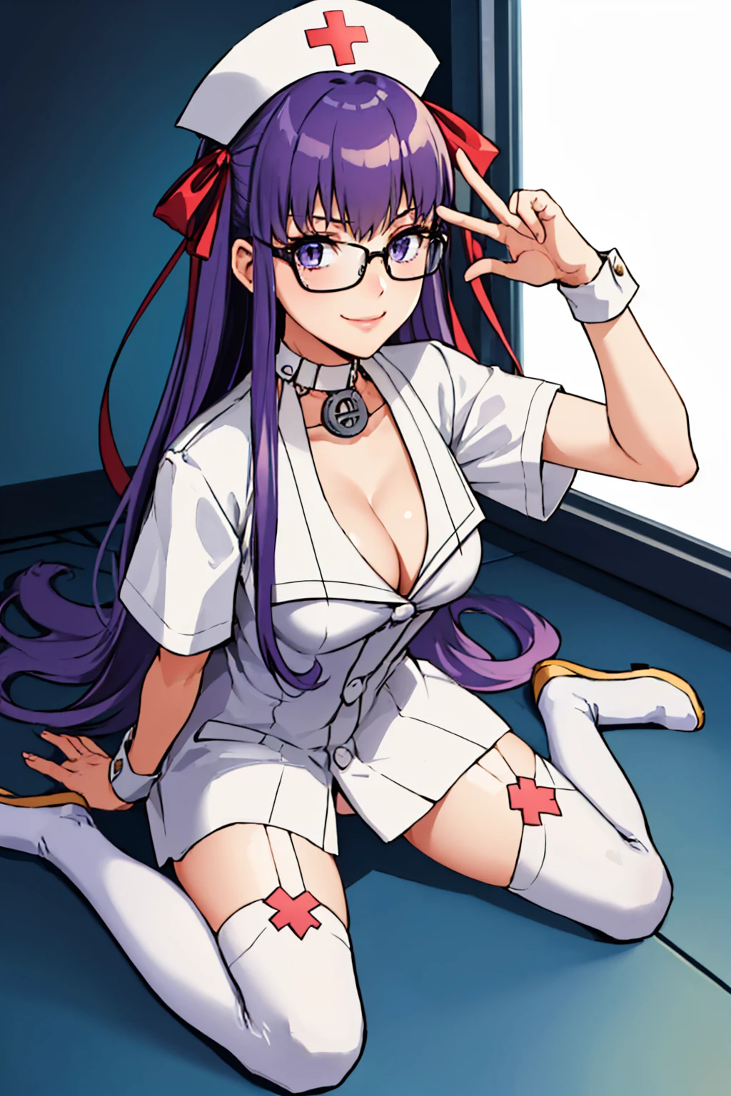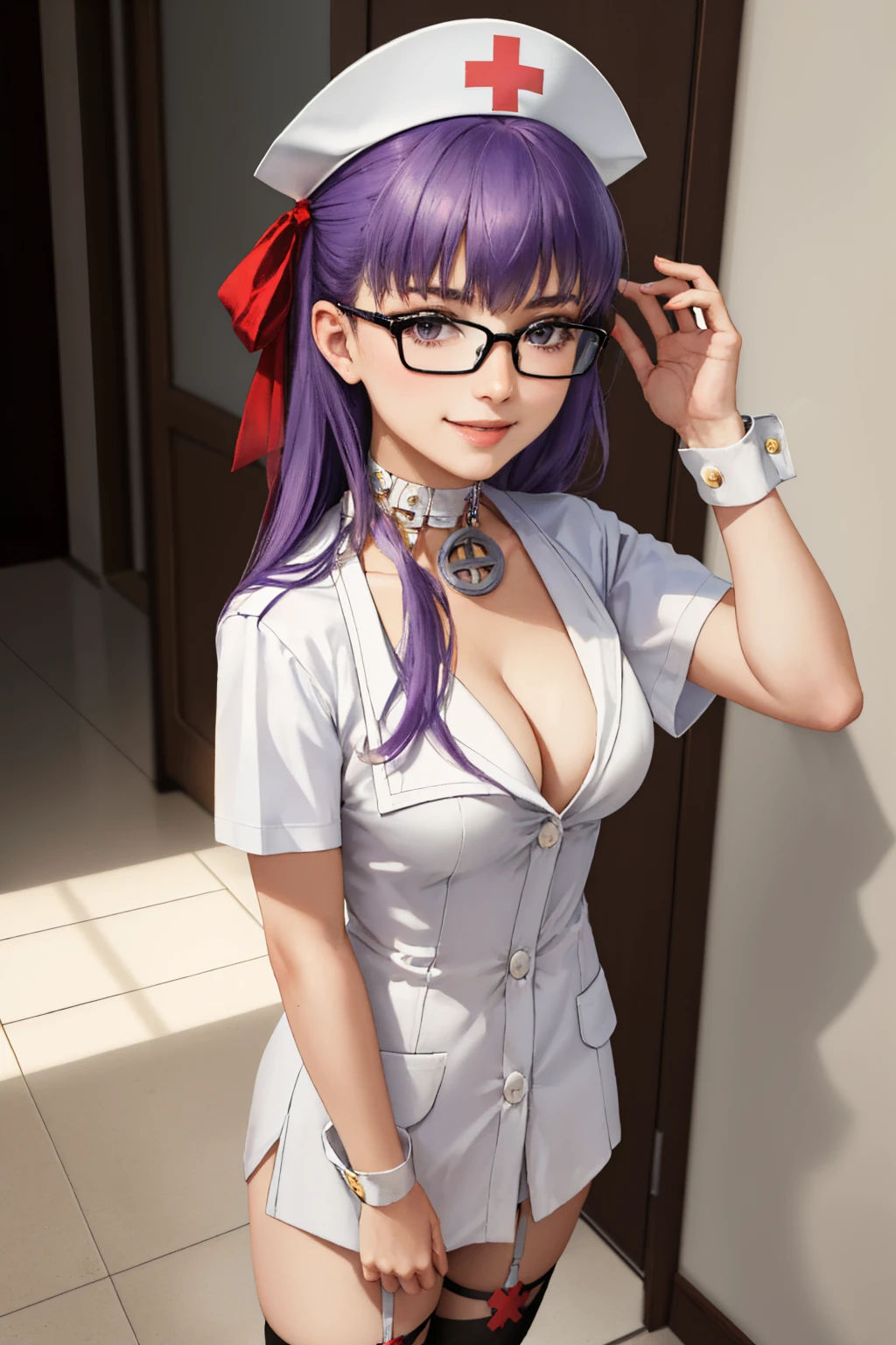 bbnurse, hair ribbon, nurse cap, glasses, white dress, short sleeves, wrist cuffs, white thighhighs, choker, cleavage