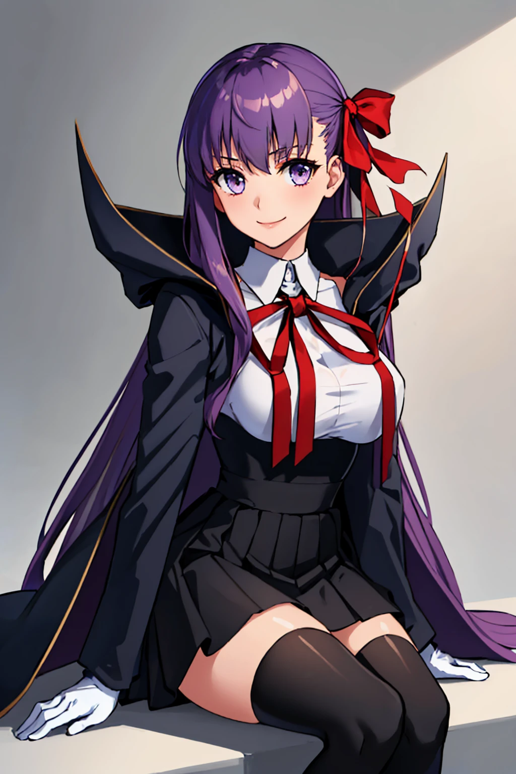 Default Outfit: bbdef, hair ribbon, coat, open coat, shirt, neck ribbon, long sleeves, white gloves, high-waist skirt, black thighhighs