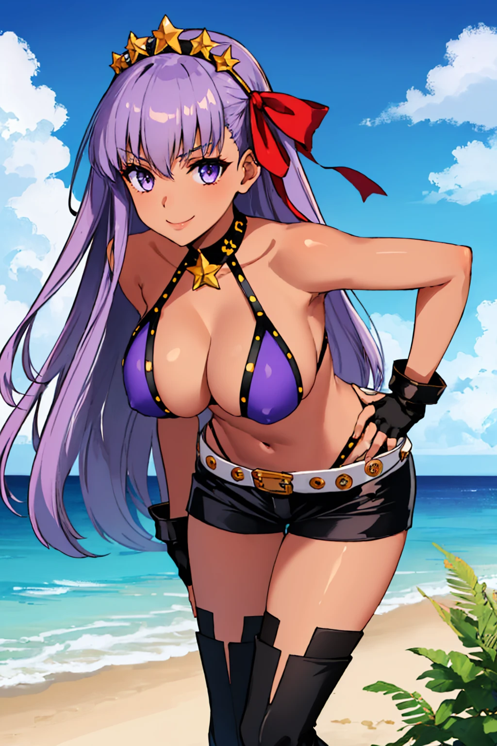 bbswimst2, dark skin, tan, hair ribbon, star hair ornament, hairband, purple bikini, fingerless gloves, black shorts, thighhighs, white belt, bracelet