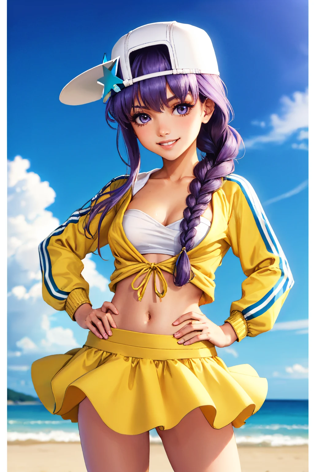 bbswimst1, single braid, baseball cap, backwards hat, star hat ornament, yellow jacket, long sleeves, bandeau, yellow skirt