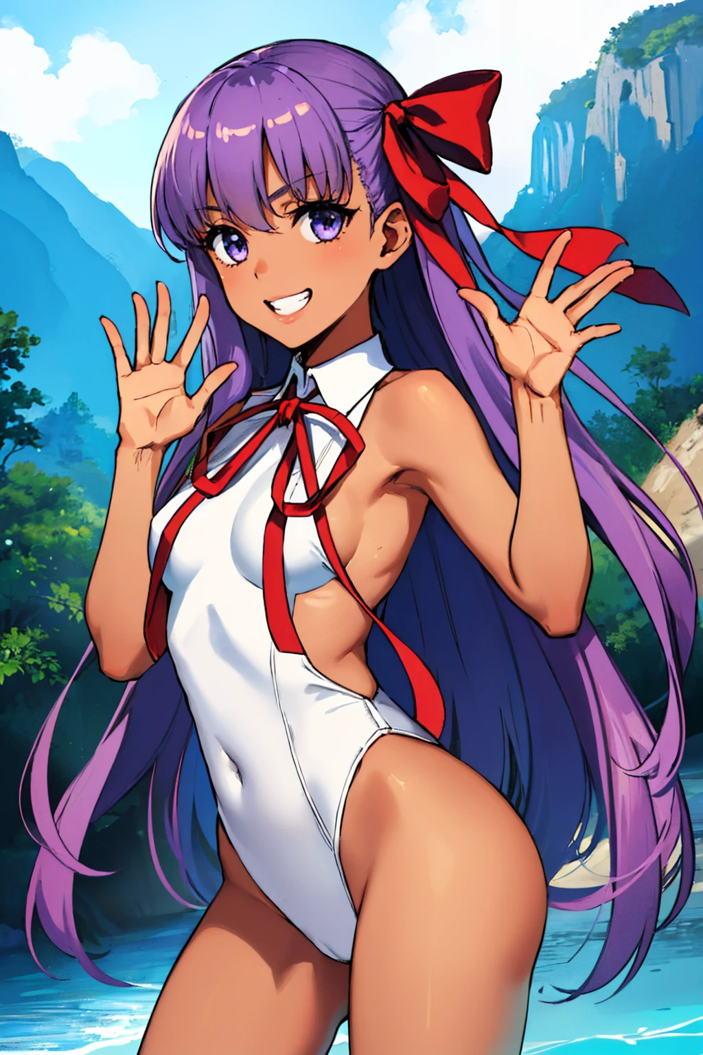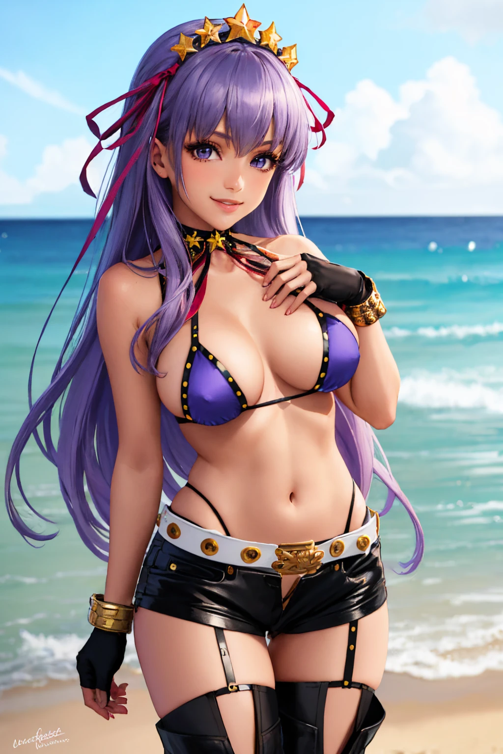 BB Pele / MoonCancer Second Ascension: bbswimst2, dark skin, tan, hair ribbon, star hair ornament, hairband, purple bikini, fingerless gloves, black shorts, thighhighs, white belt, bracelet