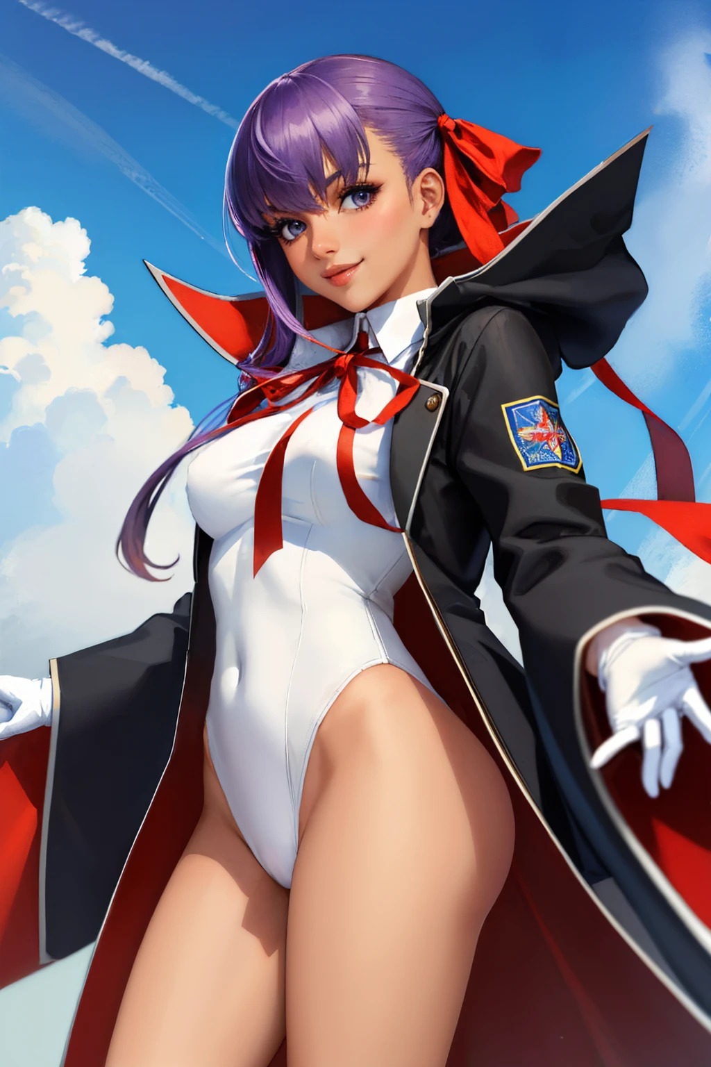bbswimst3, dark skin, tan, hair ribbon, coat, open coat, popped collar, white leotard, neck ribbon, white gloves