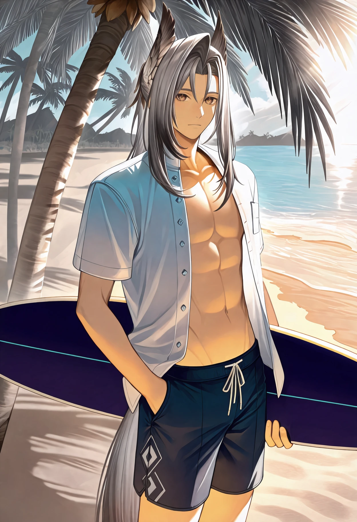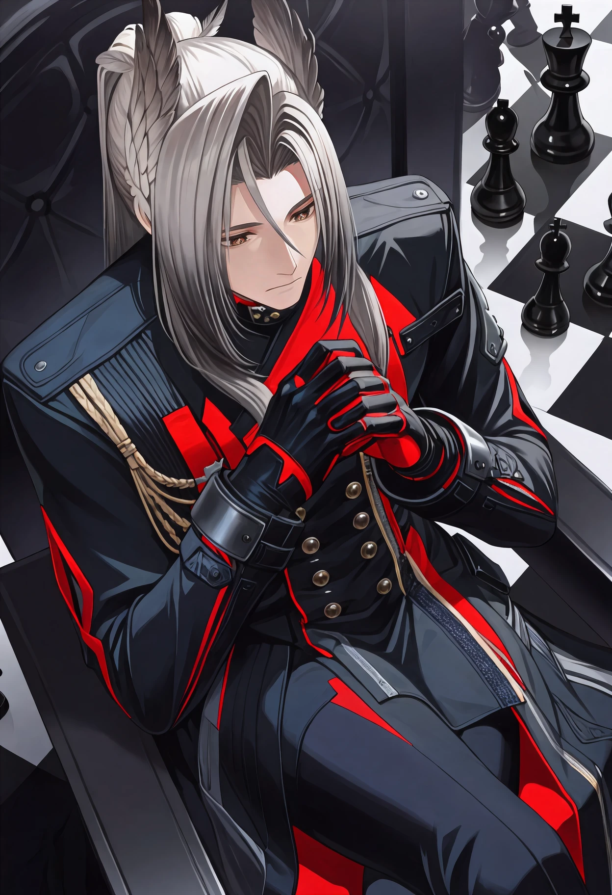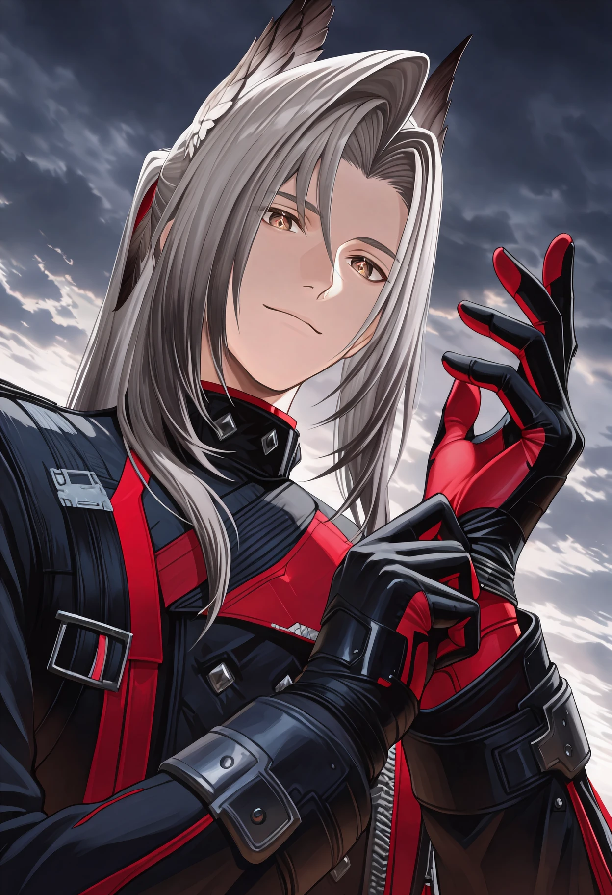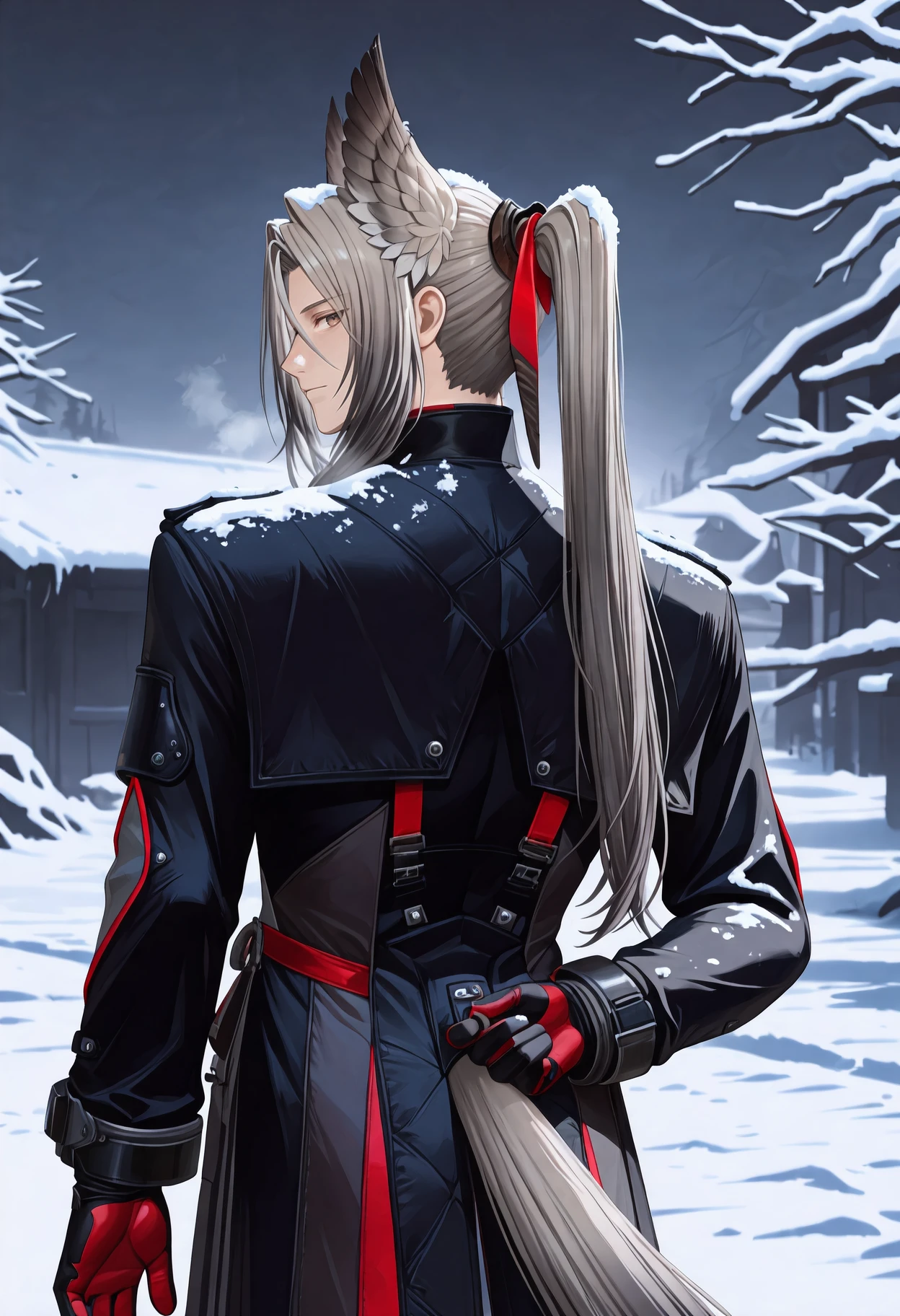 feather hair, grey hair, gradient hair, single hair intake, parted bangs, high ponytail, long hair, diamond-shaped pupils, brown eyes, black long coat, red long coat, two-tone coat, double-breasted, aiguillette, zipper, black gloves, red gloves, two-tone gloves, grey pants, black kneeboots, grey tail