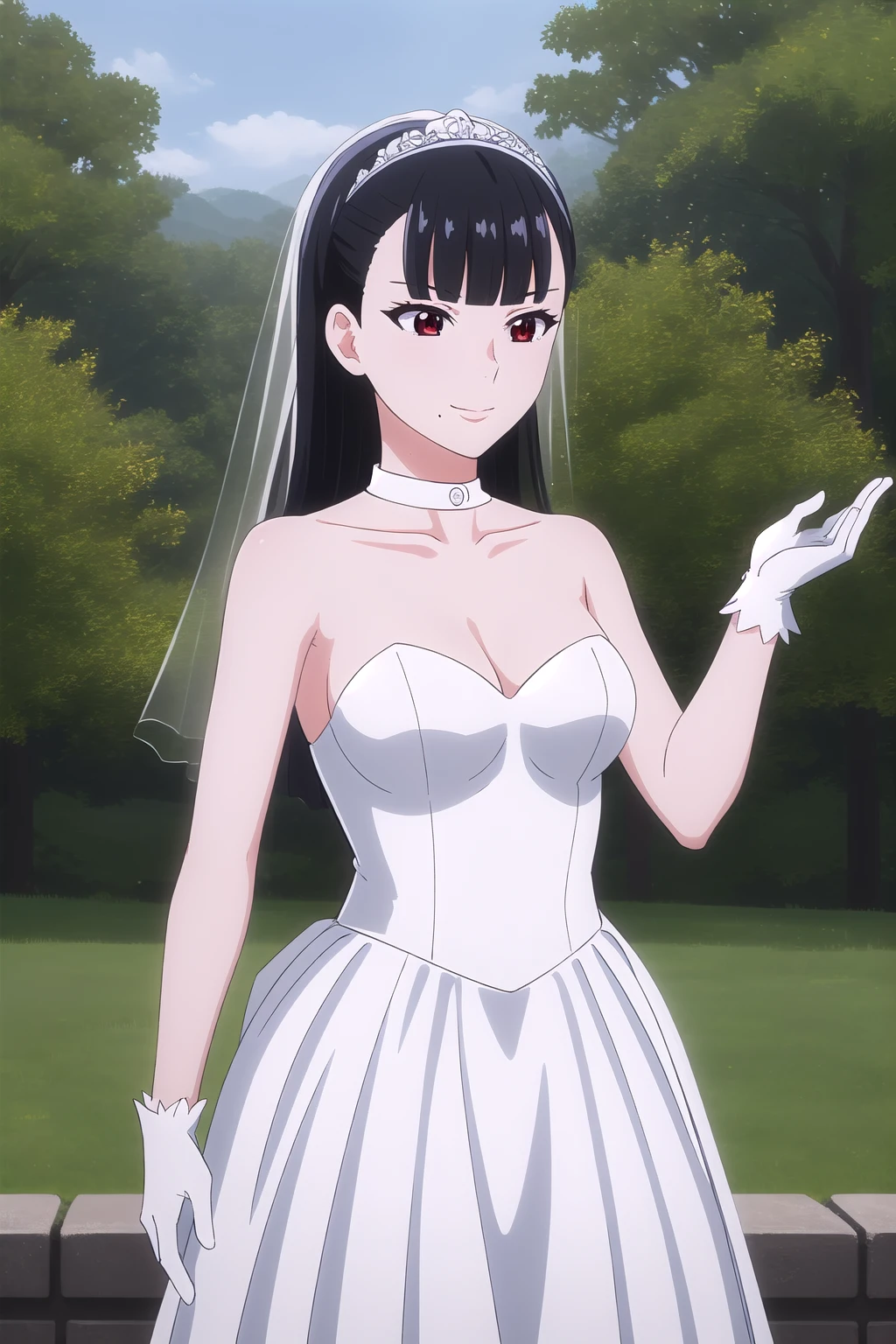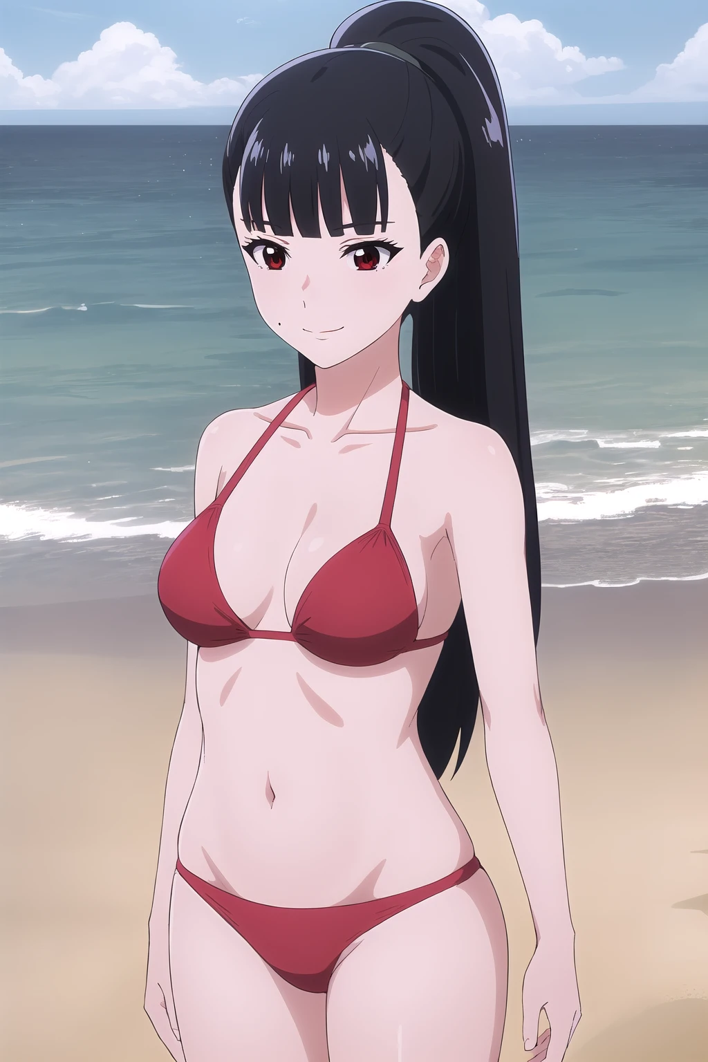 black hair, high ponytail, blunt bangs, long hair, red eyes, mole under mouth
